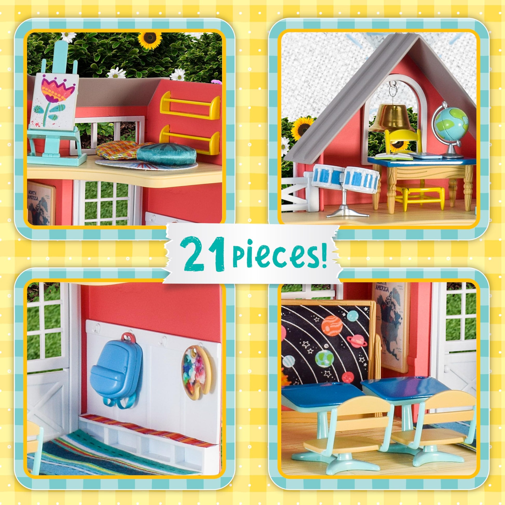 - Q: What features does the school playset include? A: The playset features 21 pieces, including a school building, art easel, desks, a spinning globe, pivoting chalkboard, outdoor slide, swing, and an exclusive teacher figure, providing an immersive play environment.