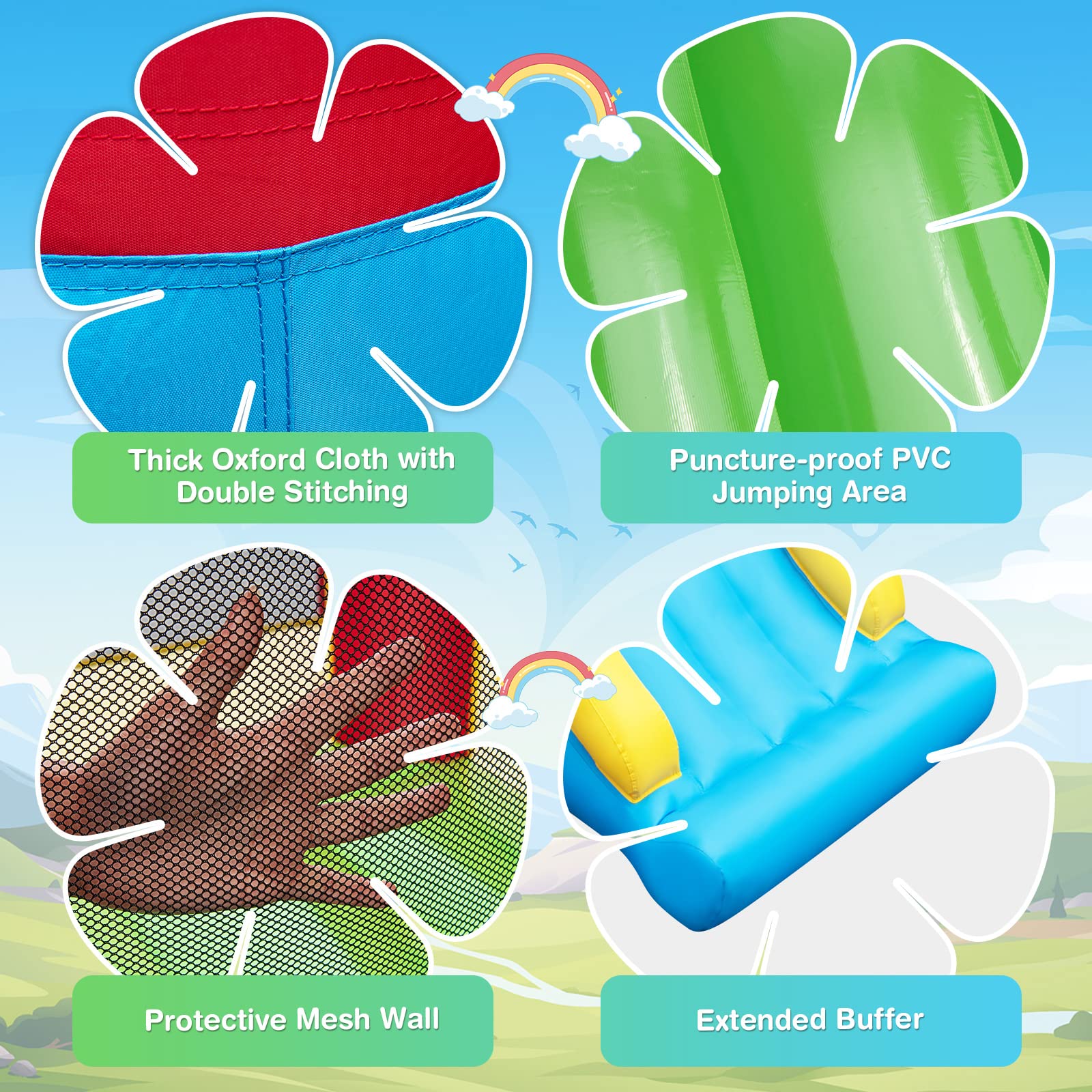 Description:Our inflatable bounce house is a great gift for children and helpful to their growth and health. The bouncer castle is brightly colored with huge jumping area basketball-playing area and a slide offer sufficient playing space for kids. Mesh walls surround the jumping area could provide a safety environment while jumping freely and you can keep an eye on them. Using wear-resistant oxford materials it is durable enough to bring continuous happiness to children and will accompany them through their childhood. You can take it anywhere by a carrying bag conveniently without the restriction of location for your children to enjoy the fun! Features:Designed with colorful and attractive rocket appearanceMade of enhanced oxford materials for good wear resistance and durabilitySafety mesh wall around the jumping area with bouncer stakes in each corner to jump safelySlide basketball rim and ample space for kids to have funComes with a carrying bag for easy carrying and storageEquipped with a powerful UL-certificated blower for quick inflation and deflationSuitable for indoor and outdoor entertainment Note: the color of the carrying bag may vary from the online picture because it is shipped in random. Specifications:Material: 600D and 420D Oxford clothNet weight: 18 lbsSize: 122 x 113.5 x 98.5 (L x W x H)Recommended for kids aged 3+Weight capacity: 385 lbs (recommended for 1-5 kids)Blower Wattage: 480W Package Includes:1 x Inflatable Bouncer1 x 480W Air Blower1 x Carrying Bag1 x Repair Kit4 x Ground Stake1 x Glue1 x Instruction