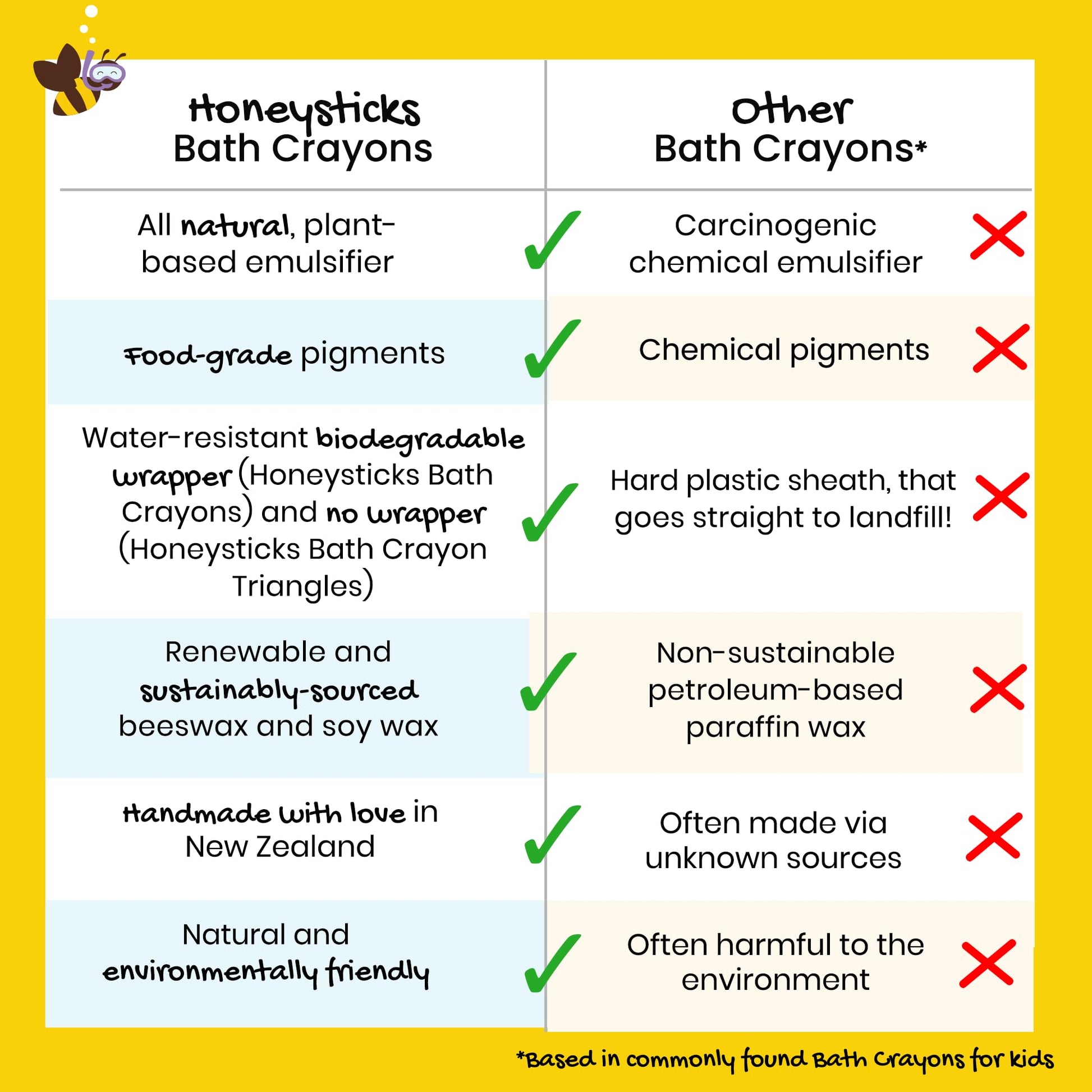 - Q: Are Honeysticks Bath Crayons eco-friendly? A: Absolutely! Honeysticks Bath Crayon Triangles are 100% plastic-free and made from a natural beeswax and soy wax blend, making them an eco-friendly choice for children's bath toys.