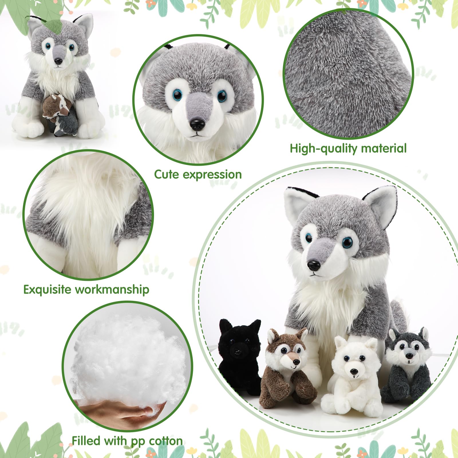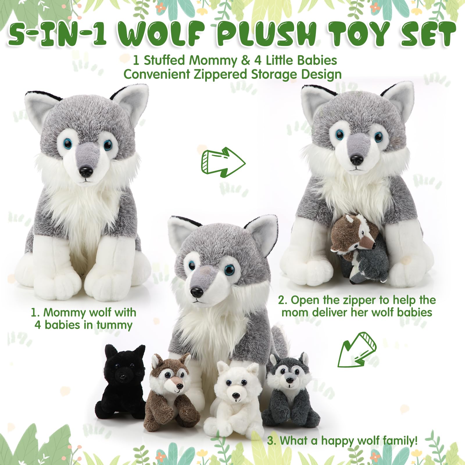 - Q: Can the mother wolf actually 'give birth' to the baby wolves? A: Yes, the mother wolf features a zipper on her belly, allowing you to unzip and reveal the four cute little wolves, providing an interactive play experience for children.