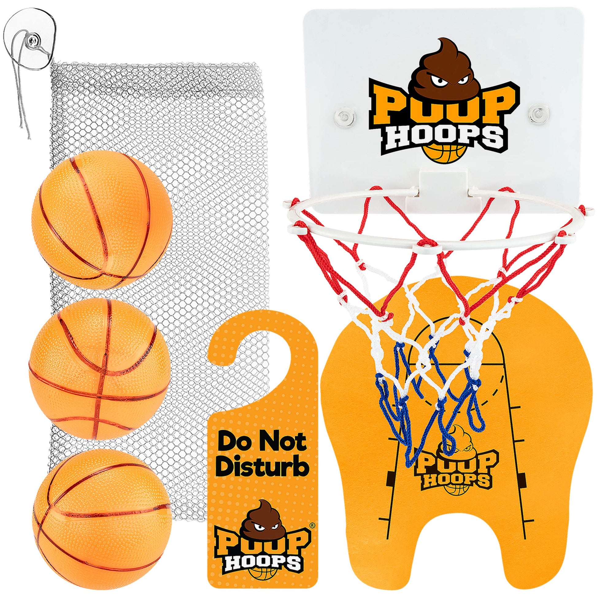 - Q: What items are included in the Poop Hoops game set? A: The complete Hoopla Toys Poop Hoops game set includes a hoop, mat, net, ball bag, door hanger, and three balls, providing everything you need to start playing right away.