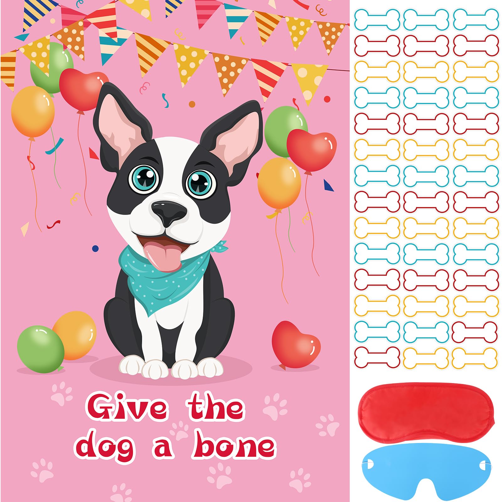 - Q: How do you play the Pin The Bone on The Dog game? A: To play, attach the poster to a wall, allow participants to write their names on the bone stickers, and then, while blindfolded, players take turns trying to place a bone sticker on the poster. The one who gets closest to the designated spot wins!