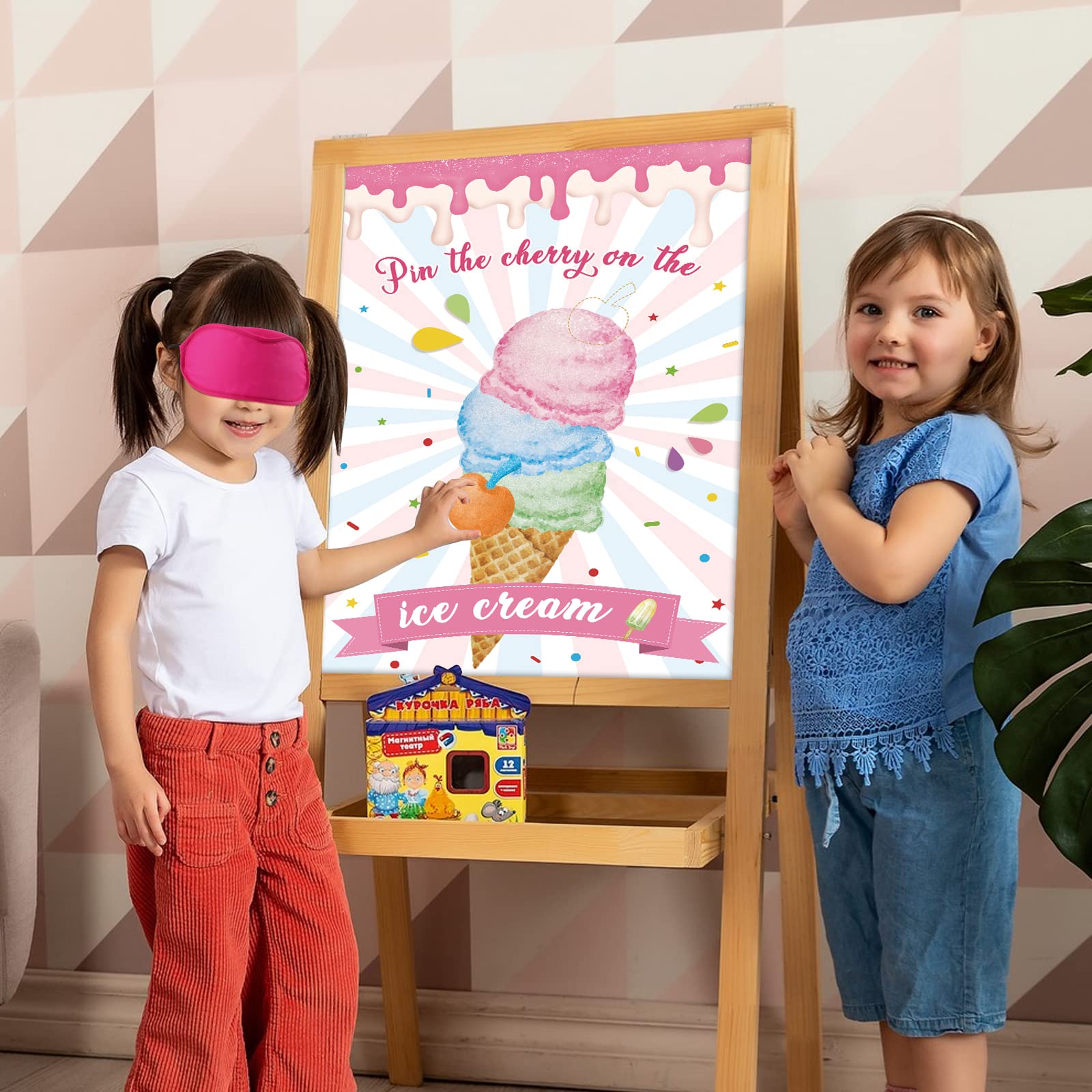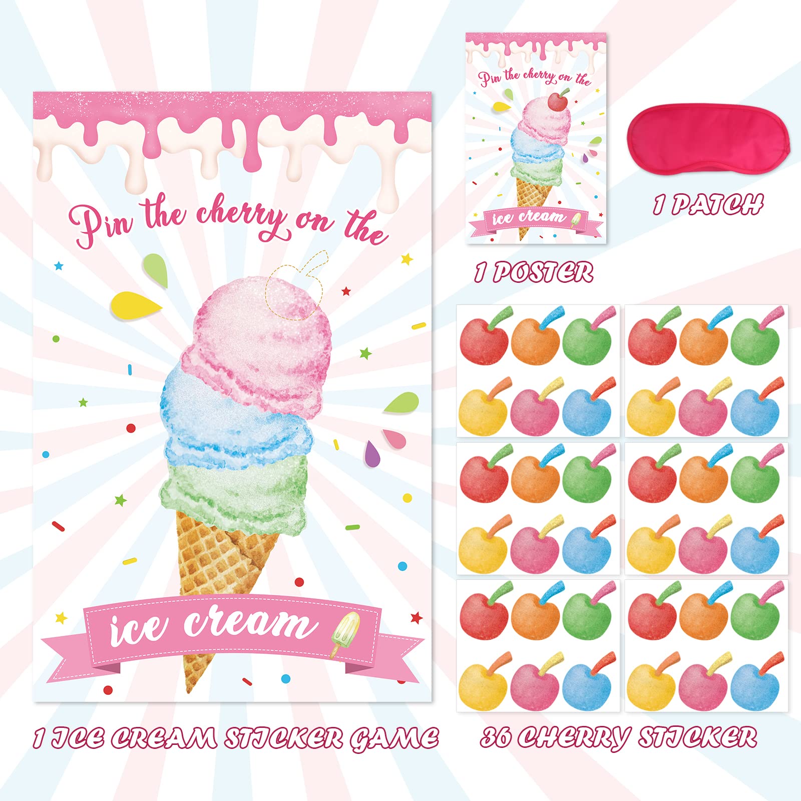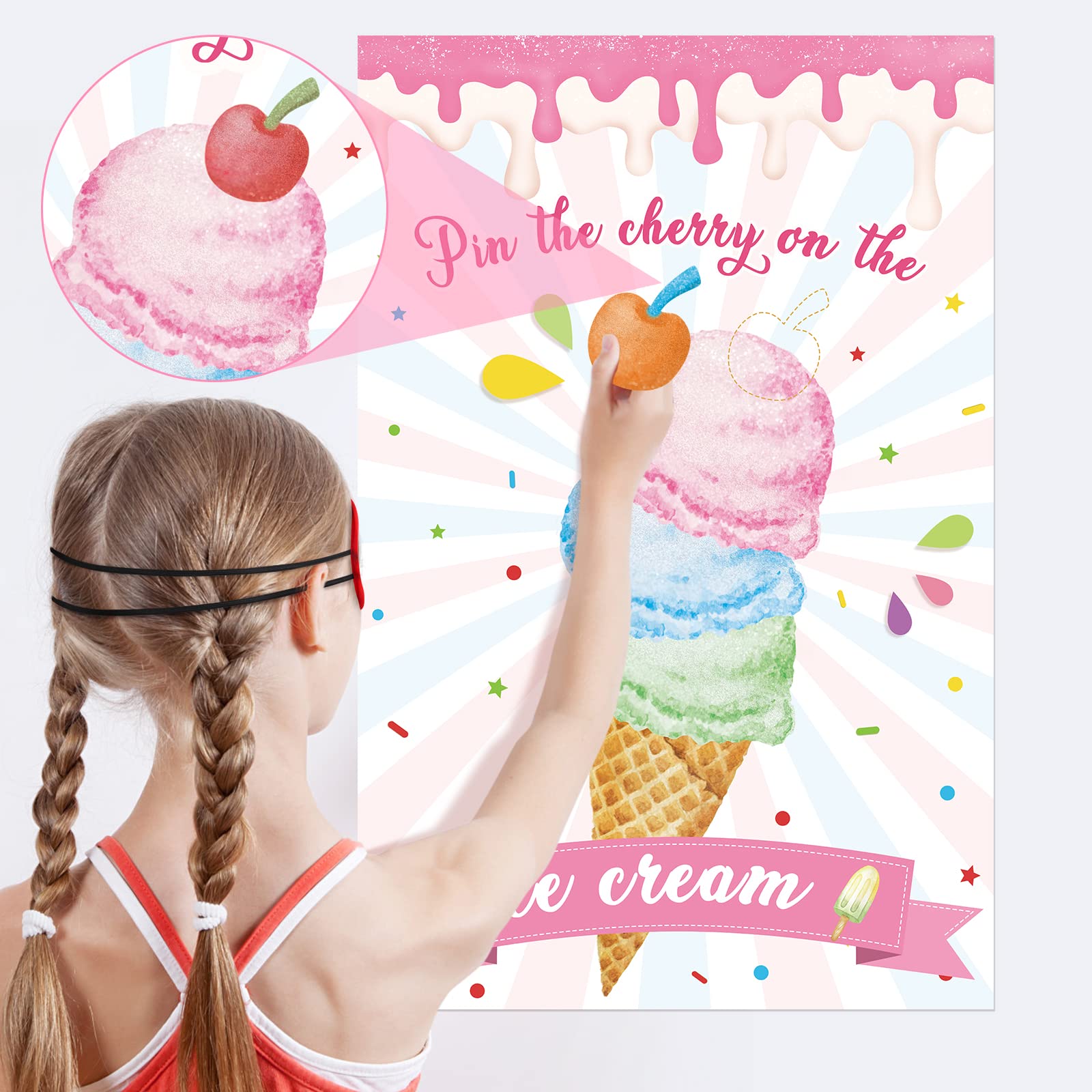 - Q: How do you play the Pin The Cherry On The Ice Cream Game? A: To play the game, first hang the large ice cream poster on a wall. Each player writes their name on a cherry sticker, then wears the provided blindfold mask. Players take turns trying to stick their cherry on the poster while blindfolded. The player who gets closest to the correct spot wins!