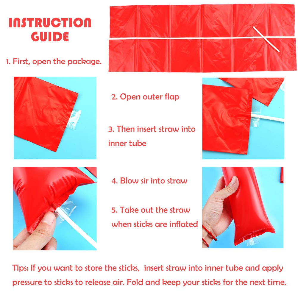 - Multi Colors Are For Your Choice; Bright-Colored Sticks Will Decorate Your Parties.- Quality Self-Sealing Inflatable Cheerleading Spirit Sticks Bang Together To Make Noise.- Can Be Carried Anywhere For Its Tiny Size. Easy To Inflate And Deflate.Using Steps:Step1: Open The Package And Find Out The Blowing Air Intake.Step2: Insert The Straw Coming Along With The Sticks.Step3: Inflate Air Via The Straw.Step4: Use Your Noise Sticks Making A Bang Bang Sound.Step5: Can Be Deflated Via The Straw When Do Not Use.Step6: Fold And Keep It Good For The Next Time.
