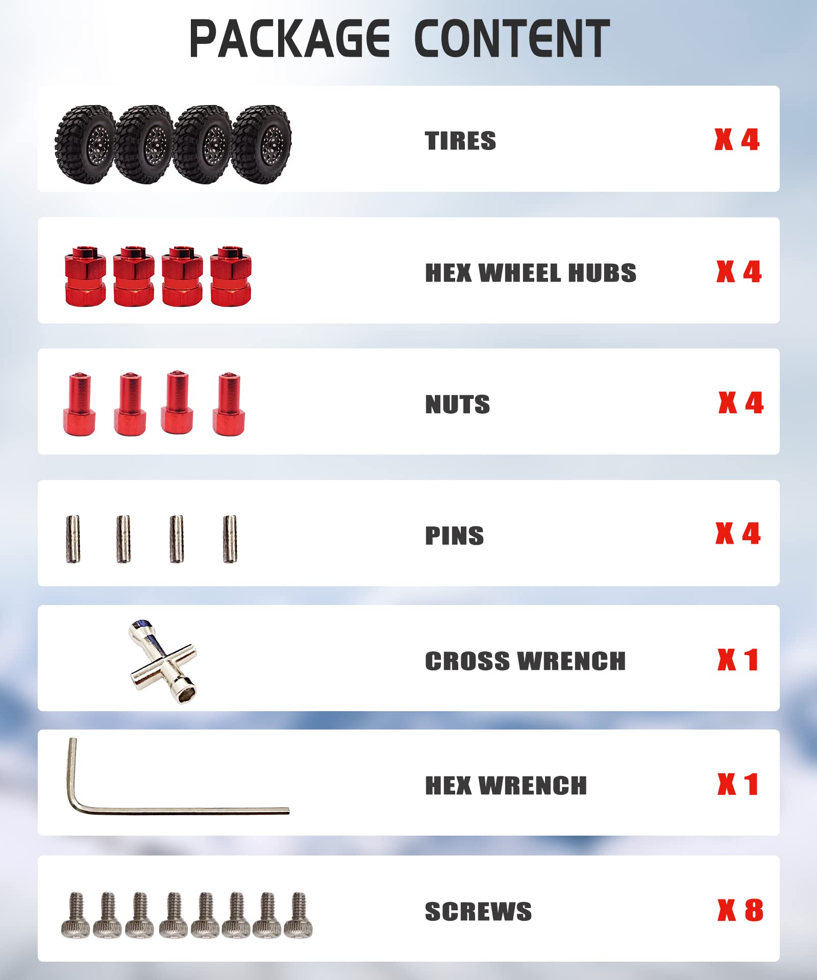 - Q: What is included in the package when purchasing the HOPLEX tires? A: The package includes 4 rubber RC tires along with necessary accessories, and it also comes with a cross wrench tool to facilitate easier disassembly and installation.