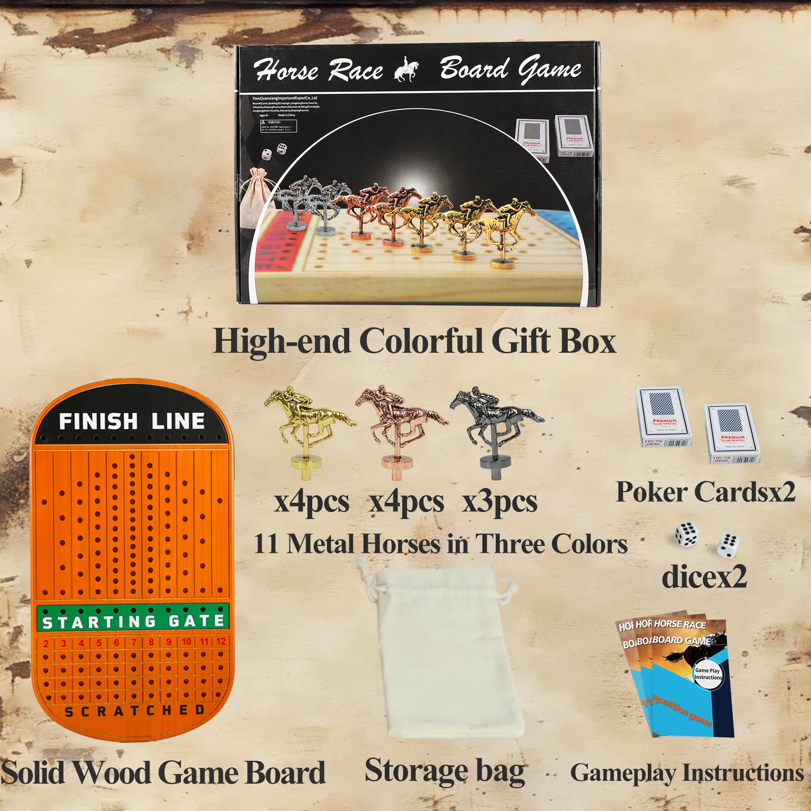 The Horse Racing Board Game Set Come With Everything You Need To Get Started.It Includes A Game Board Of 21X11.8X0.8 Inches,11 Metal Horses (4 Gold, 4 Rose Gold, 3 Silver Horses), A Metal Horses Storage Bag,4 Dices, 2 Sets Of Playing Cards, A Detailed Instruction And A Luxurious Gift Box.