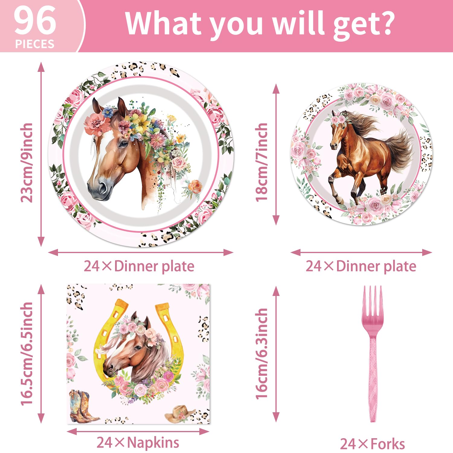 - Q: What comes included in the Horse Birthday Party Supplies set? A: The Horse Birthday Party Supplies set includes a total of 96 pieces, featuring 24 each of 9-inch dinner plates, 7-inch dessert plates, napkins, and plastic forks, designed to serve 24 guests.