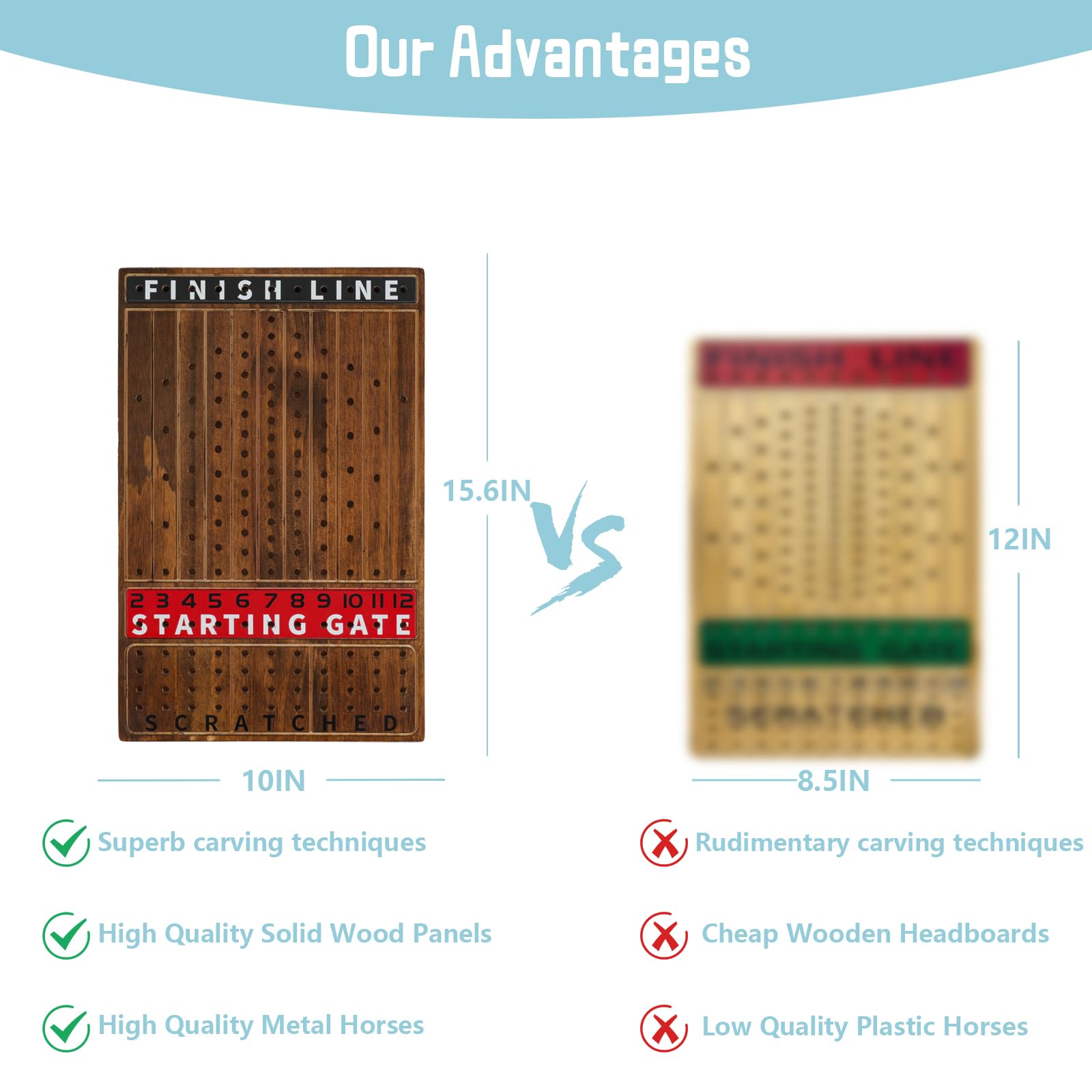 ?Full Set Of Luxury Gift Package?Our game board is made of high-quality pine wood and is durable. It includes a 15.6x10x0.59 inch game board, 11 metal horses (4 gold, 4 rose gold, and 3 silver horses), a metal horse storage bag, 2 dice, 2 sets of poker cards, a detailed description, and an exquisite packaging box. The product is fully equipped, providing you with a better gaming experience. | ?Exquisite Craftsmanship?Our game board is made of high-quality solid wood, with lines carved on the wood, making it easy to distinguish game areas and less prone to damage. The text and patterns on the game board are printed using advanced printing techniques, and are covered with a waterproof coating after printing, which not only protects the game board but also ensures that it does not fade. | ? A Crowd-Pleasing Classic?: This horse racing board game is loved by players of all skill levels and ages, accommodating up to 11 people for a lively gaming experience. Each player selects a horse and rolls the dice to move it along the track - perfect for family parties and gatherings with friends! | ?A Great Choice As A Present?This board game not only has good quality, but also has exquisite design and complete accessories. Our game board is made of high-quality materials and exquisite craftsmanship. The metal horse is sturdy, durable, and looks very high-end. At the same time, we are equipped with the dice and playing cards required for the game lock, and we have prepared storage bags and colorful packaging boxes. Without a doubt, this is a very sincere present. | ?Customer Guarantee?Our product packaging is exquisite, and pearl cotton is placed in the express box to prevent transportation collisions, hoping to provide customers with the best shopping experience. If you have any issues with the product, please do not hesitate to contact us for assistance.