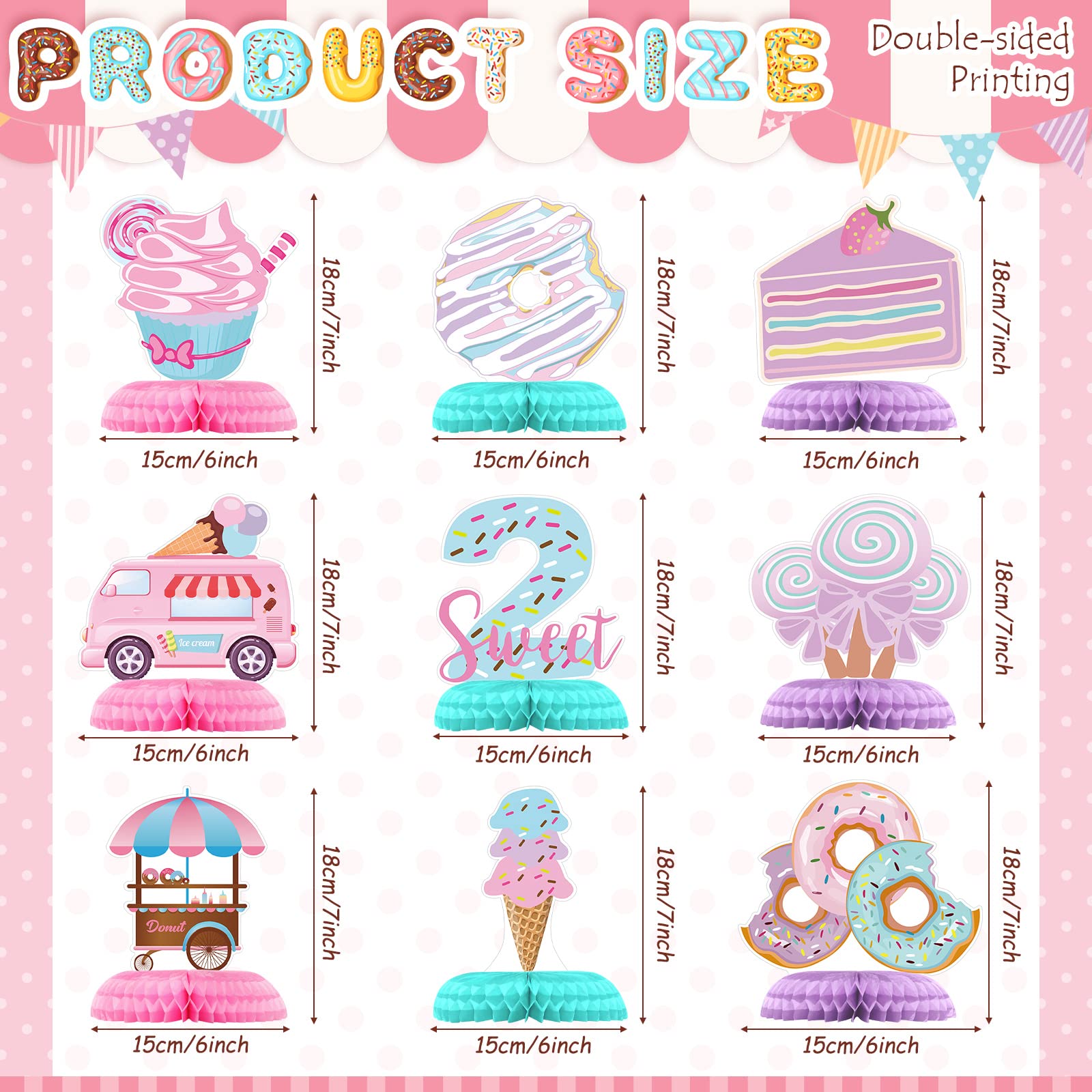 - Q: How many pieces are included in the package? A: The package includes a total of 9 pieces of donut honeycomb centerpieces, each featuring different adorable designs suitable for a two sweet birthday theme.