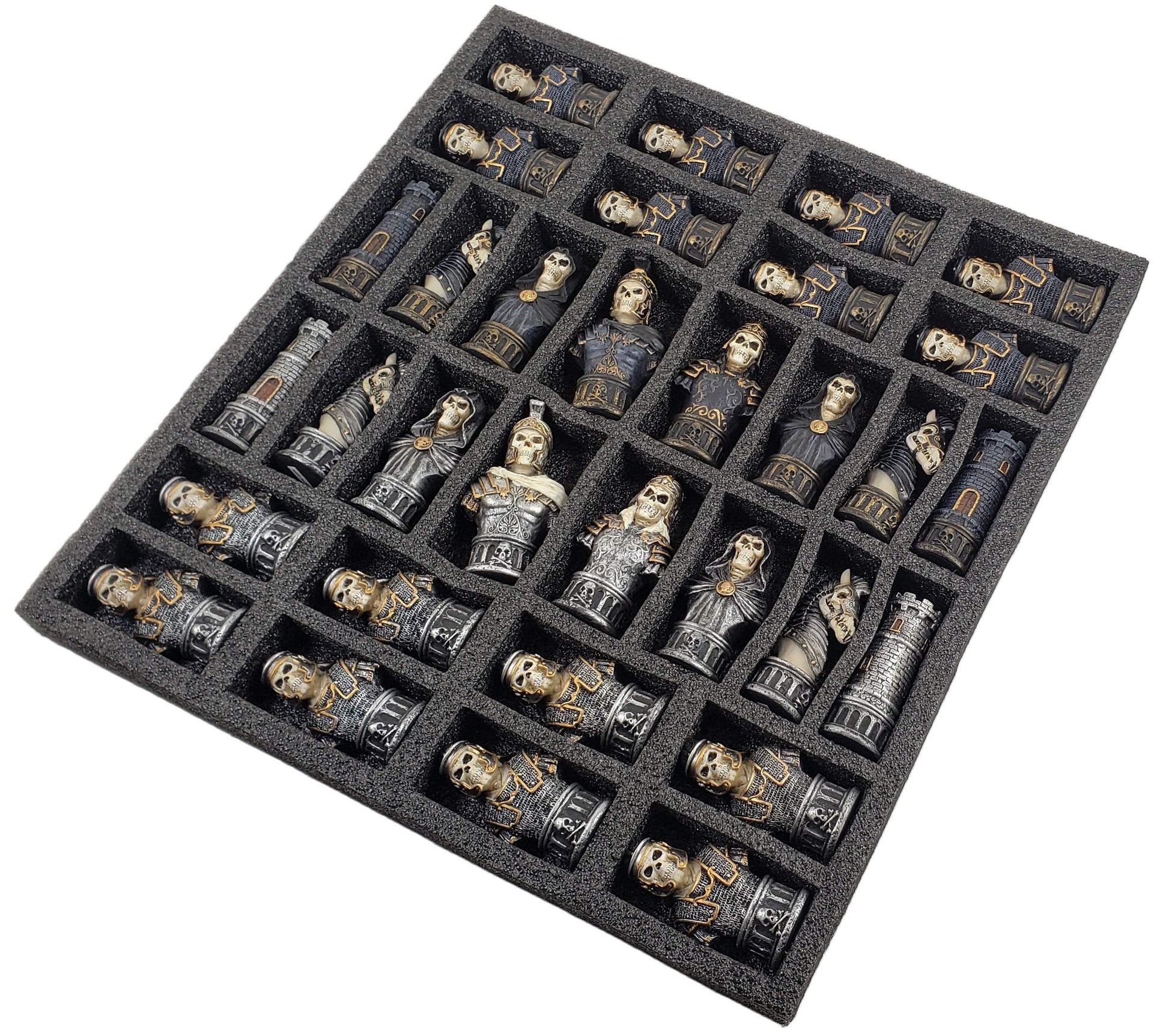 - Q: Does the set come with a board? A: No, the HPL Medieval Times Skull Busts Chess Men Set does not include a chess board. This listing is solely for the 32 hand-painted chess pieces, which come in a decorative box with foam storage.