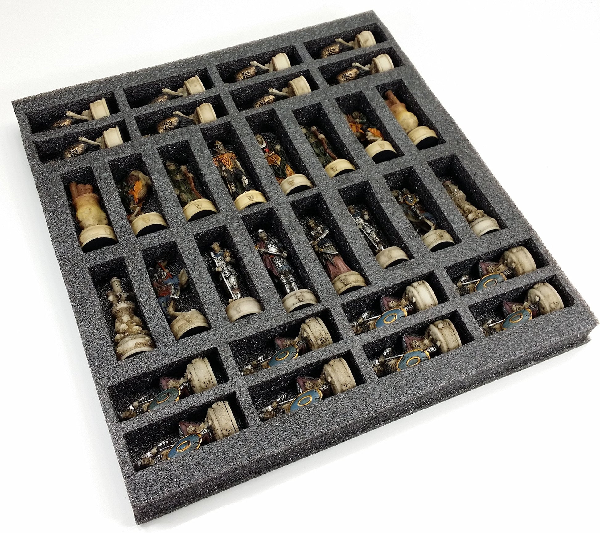 This listing is for a brand new hand painted chess men set. NO BOARD. Men are solid resin, hand painted and have felt bottoms. - King: 3 1/4 - Queen: 3 1/8 - Bishop: 3 - Knight: 2 3/4 - Rook: 2 3/4 - Pawn: 2 5/8 - Base Diameter - 1 - Total Piece Weight: - 1.9 Pounds - Men in come in a decorative box with foam storage.