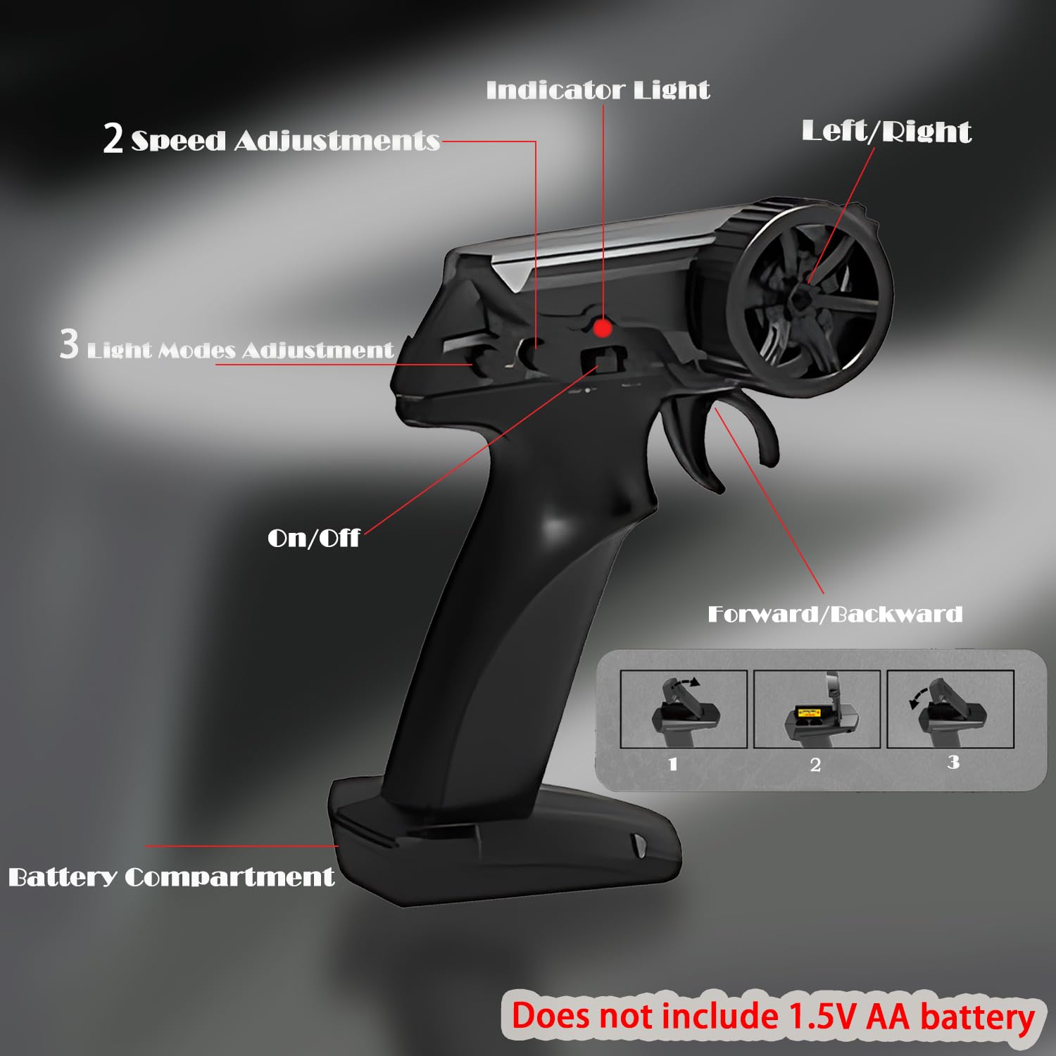 High Speed Drift Car: This 2.4GHz remote control drift car can reach speeds of up to 25KM/H and has a speed adjustment function, providing an exhilarating and fast-paced driving experience for enthusiasts of 8-9-10-11.. ages. | 4WD Vehicle: With a 4-wheel drive system, this remote-controlled drift car offers superior traction and control, allowing for precise maneuvers and drifts on various surfaces. | Variety Lighting Modes:Equipped with Headlights, Flank lights,Taillight, Even though low light conditions won't dampen the thrill of racing. The car's headlights automatically illuminate at startup, adding an extra layer of realism to your kids' adventures and races. Help your kids be the coolest kids among their friends! | Replaceable Wheels: The drift car comes with replaceable wheels, allowing you to easily customize and upgrade their vehicle for optimal performance and style. | Long Playtime: HTURCCOP remote control car features a rechargeable battery design, reducing the cost and hassle of battery purchases, while fostering kids environmental awareness. Two batteries with a total capacity of 1000mAh ensure over 60 minutes of playtime.The battery charging process prevents your child from getting overly addicted to the RC car | High-Performance 2.4GHz Remote Control: The 2.4GHz remote control ensures a stable and responsive connection between the controller and the drift car and Multiplayer play without interruption making it easy for users to perform drifts, spins, and other exciting maneuvers with precision and ease.