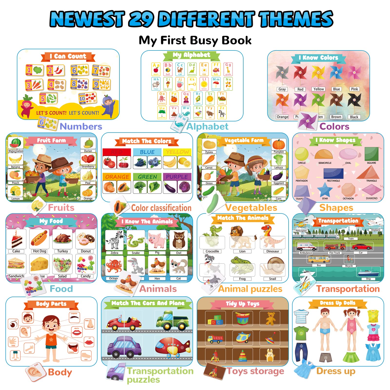 - Q: What themes are covered in the Busy Book, and how do they benefit my child? A: The Busy Book covers 15 themes, including numbers, alphabet, shapes, and colors. These themes enrich a child's knowledge base, promote cognitive development, and support early learning in a fun and interactive way.