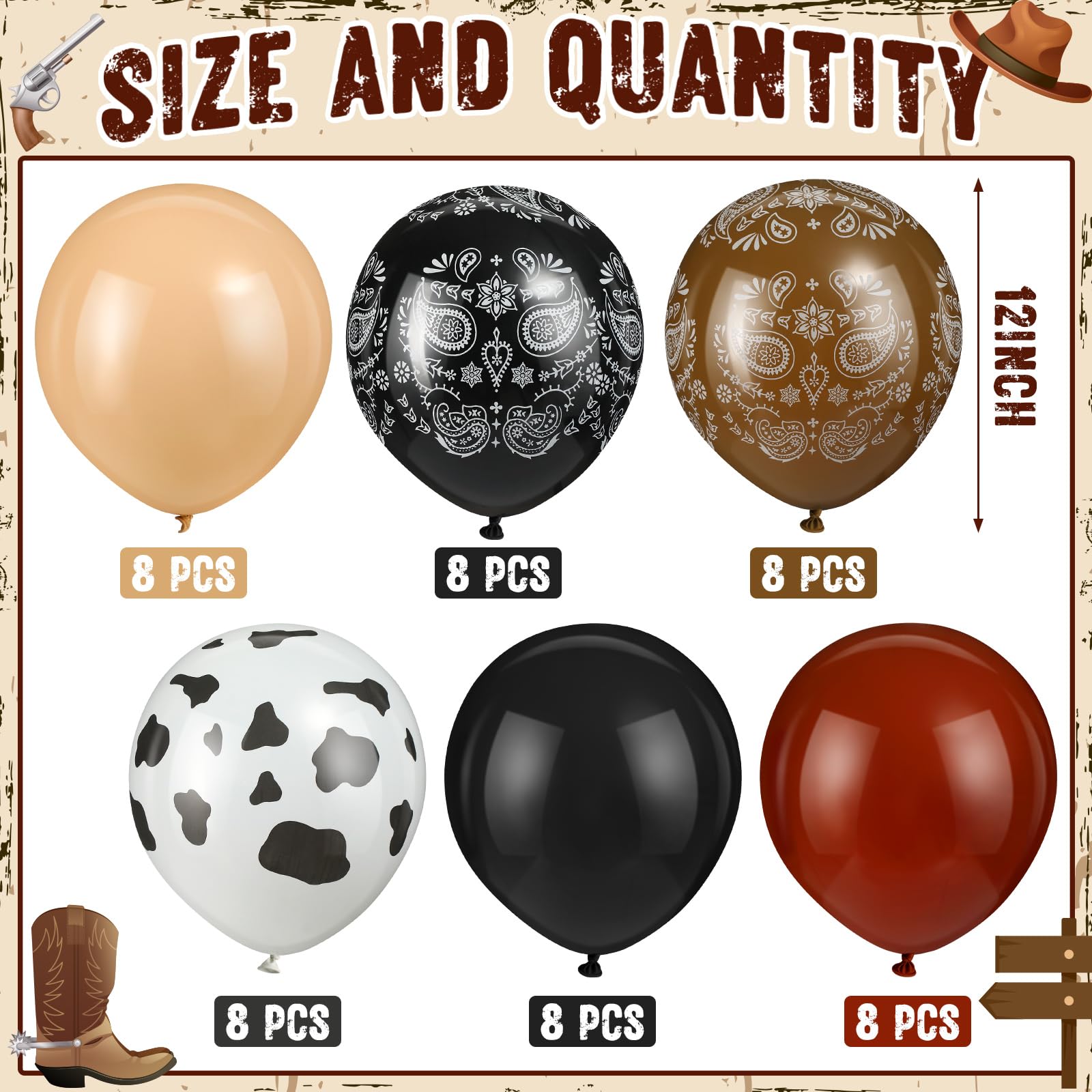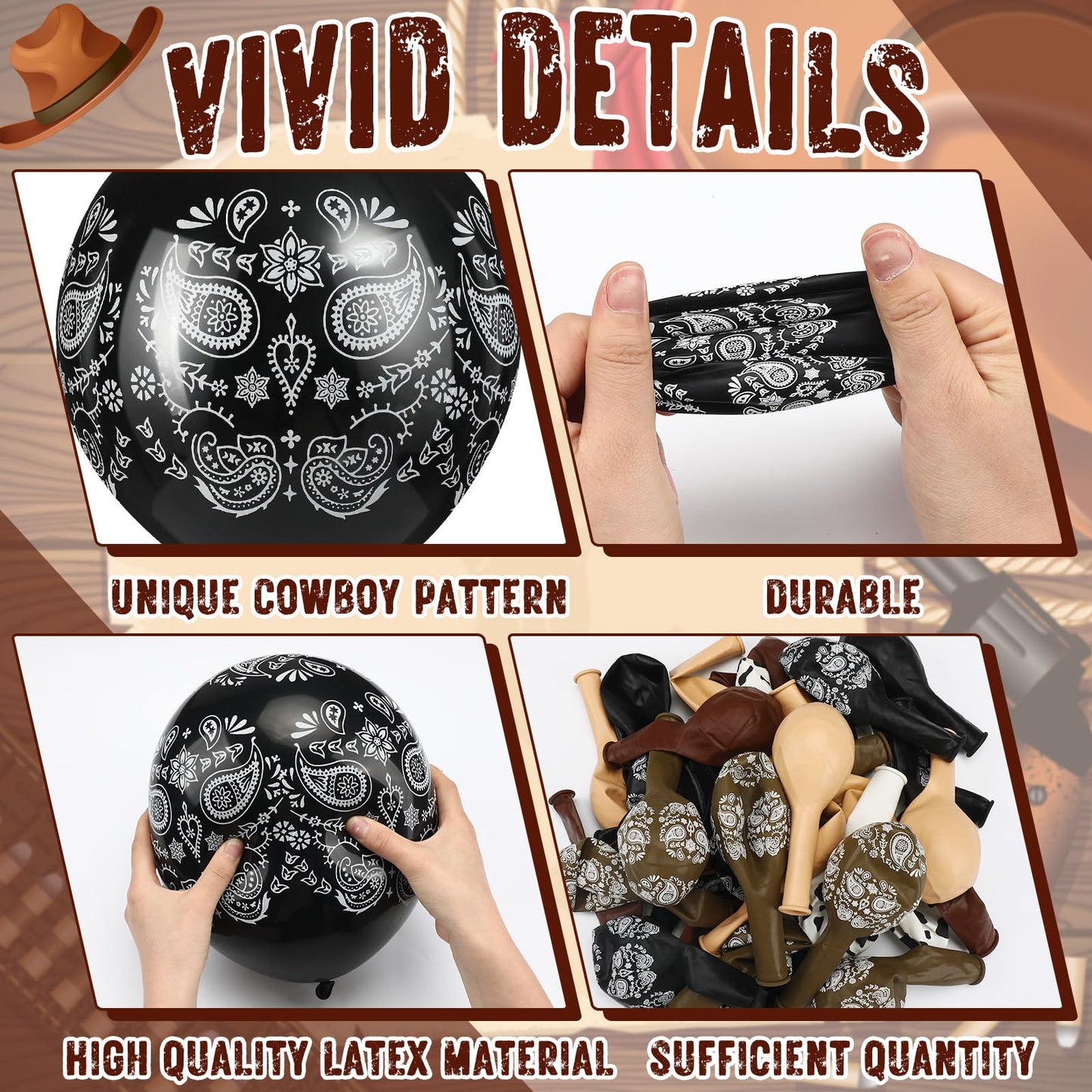 - Q: Are there any color variations available in this balloon set? A: This balloon set features a 'Dark Series' color scheme, including brown, white, and black balloons, which are perfect for creating a cohesive cowboy-themed decoration.
