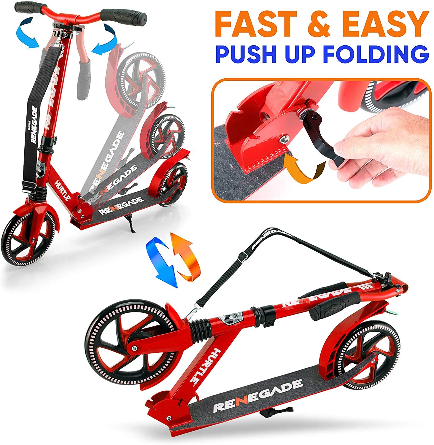 Folding kick scooter for teens and mature-themeds Our adjustable Red kick scooter is the perfect choice for you if you are looking for a scooter that provides a comfortable and safe riding experience. With 3 height options on the T-bar handlebar you can rest assured that you wont need to crouch over the handlebars while riding thus reducing any back or muscle pain. The well-made brakes and 8 wheels ensure that you will never lose control at high speeds and that you will come to a quick safe stop when needed. Foldable lightweight 2 wheel scooter Easy to carry this Red scooter is the perfect choice if you are commuting to work and need to carry it onto public transport or maybe youre a college student and you need to carry it on to campus? This quick folding scooter is lightweight and super convenient - a fun ride to work or school that keeps you fit too! Sizing information We recommend this Red scooter for riders aged 8 and above. The adjustable handlebar allows you to fit the scooter to your child as they grow and the extended alloy deck makes this scooter a great choice for teenagers and mature-themeds too. Each kick scooter measures 32. 1 x 11. 3 x 37. 6 inches and weighs around 10 pounds. BUY NOW and ride along in style on this amazing Hurtle 2 wheel scooter!