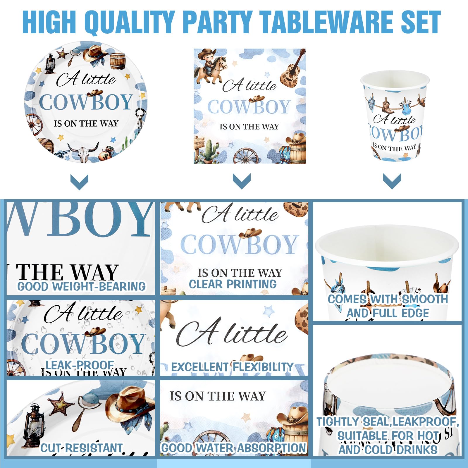 Hushee 200 Pcs a Little Cowboy Is on the Way Baby Shower Paper Plates Napkins Cups Cowboy Baby Shower Party Supplies Tableware S