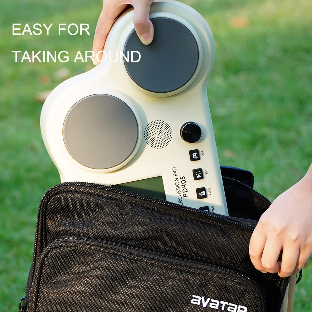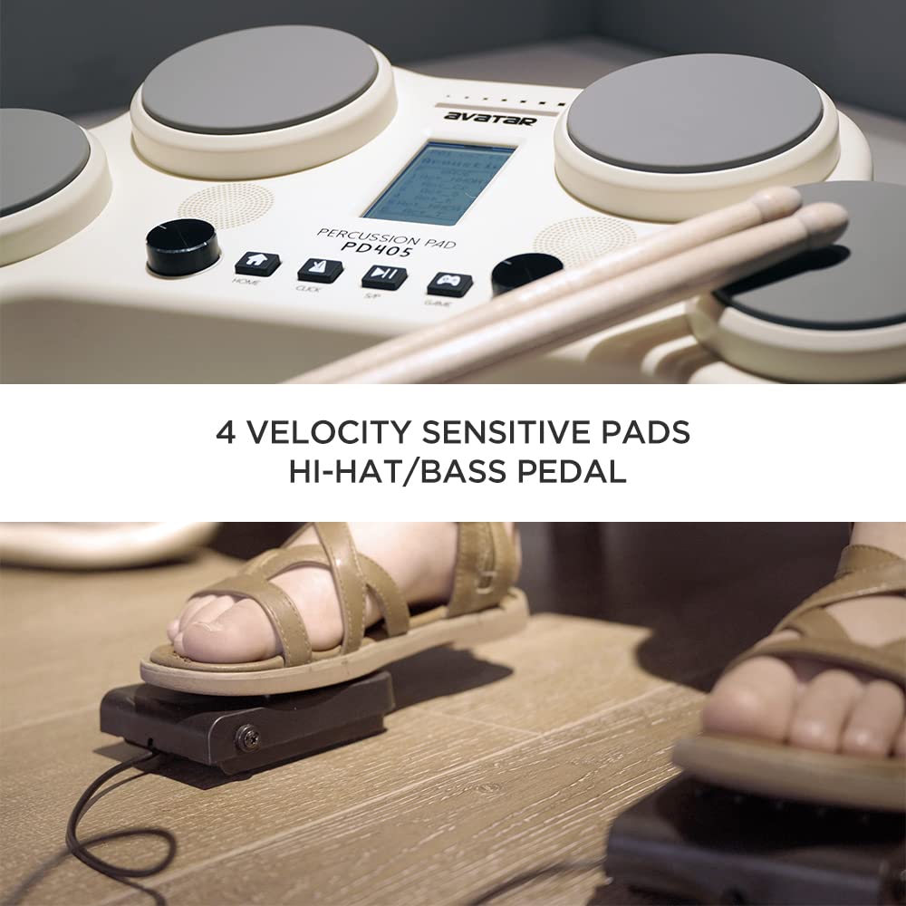 PD405 Percussion Pad - 4 silicone pads offer vivid dynamic with velocity sensitivity. 2 digital pedals ensure full foot control. It's ultra-portable all-in-one digital drum set. | Beat The Rhythm And Cool Sounds - 163 in-demand sounds, 30 presets and 25 game songs, covers multiple music styles like acoustic, pop, funk etc,. | Powerful, Fun Educational Features - Shows notes on LCD screen clearly, provides intuitive drum learning experience. Take you from zero to a hundred. | With Built-in Speakers, Play Out Of Box - Just plug the power cord, or insert 6 pcs AA batteries, then you