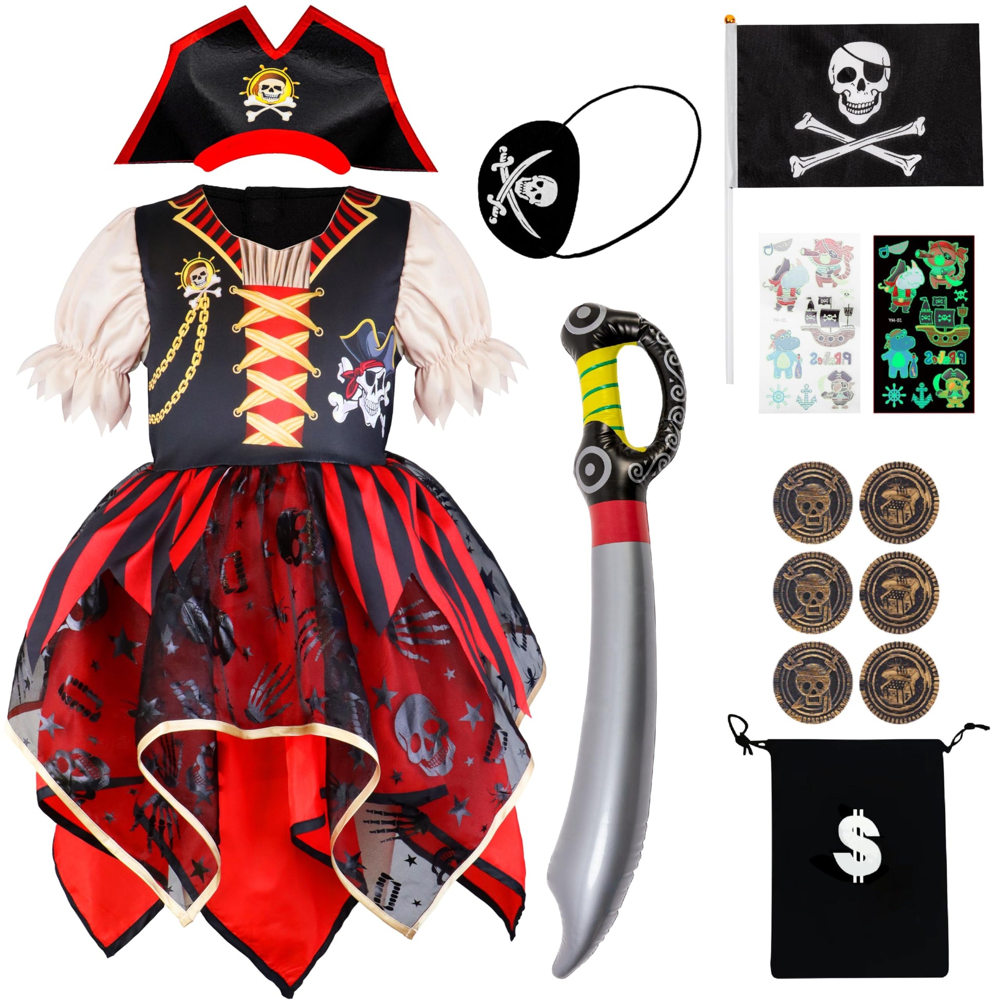 IKALI Girls Pirate Costume with Hat Accessories, Buccaneer Princess Fancy Dress Outfit for Kids 4-6 Years Themed Party Role Play