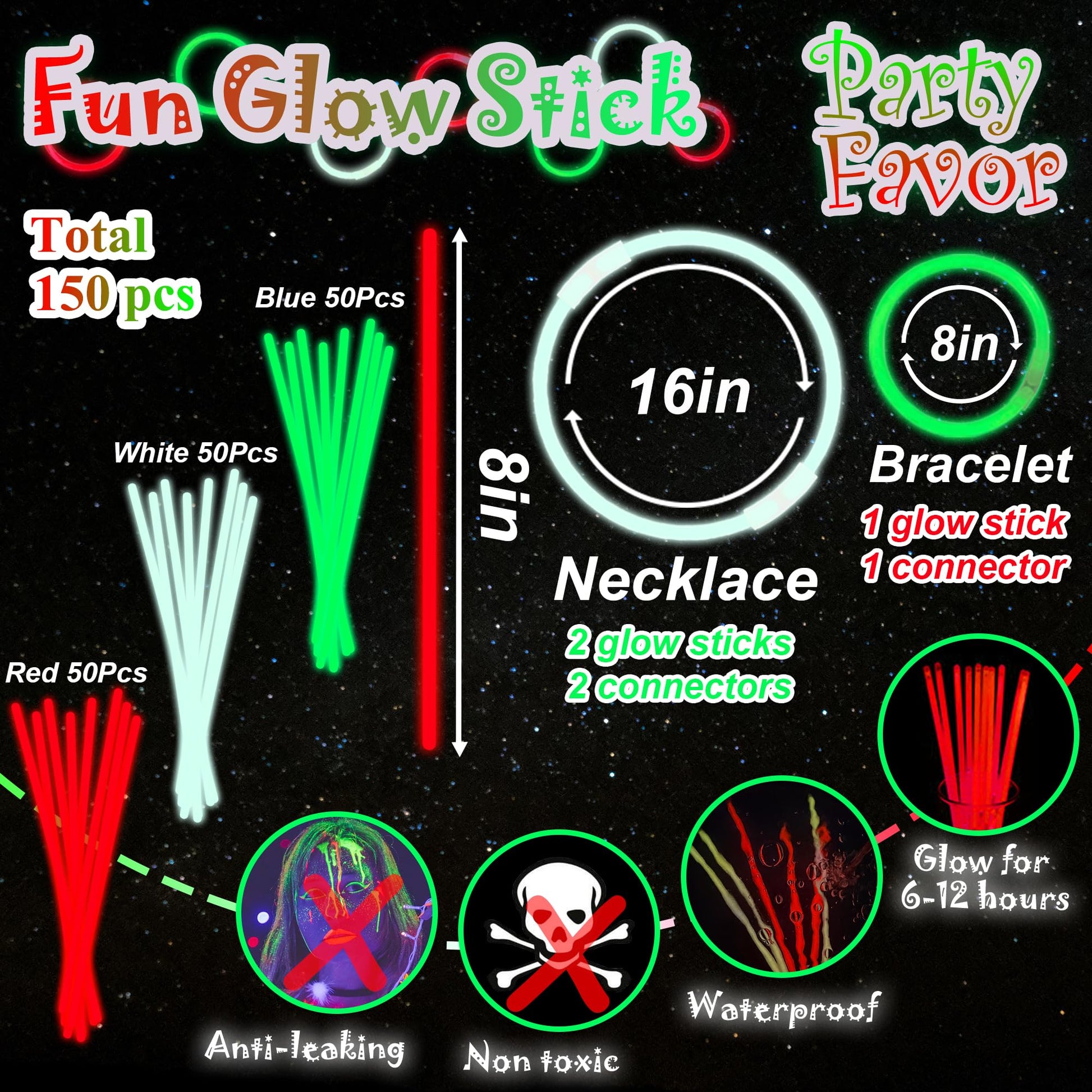 View compareILHSTY 150 Pcs 8 Green Red White Glow Sticks Glow Necklaces In The Dark Party Favors Supplies Bright GlowSticks Bulk with Acce