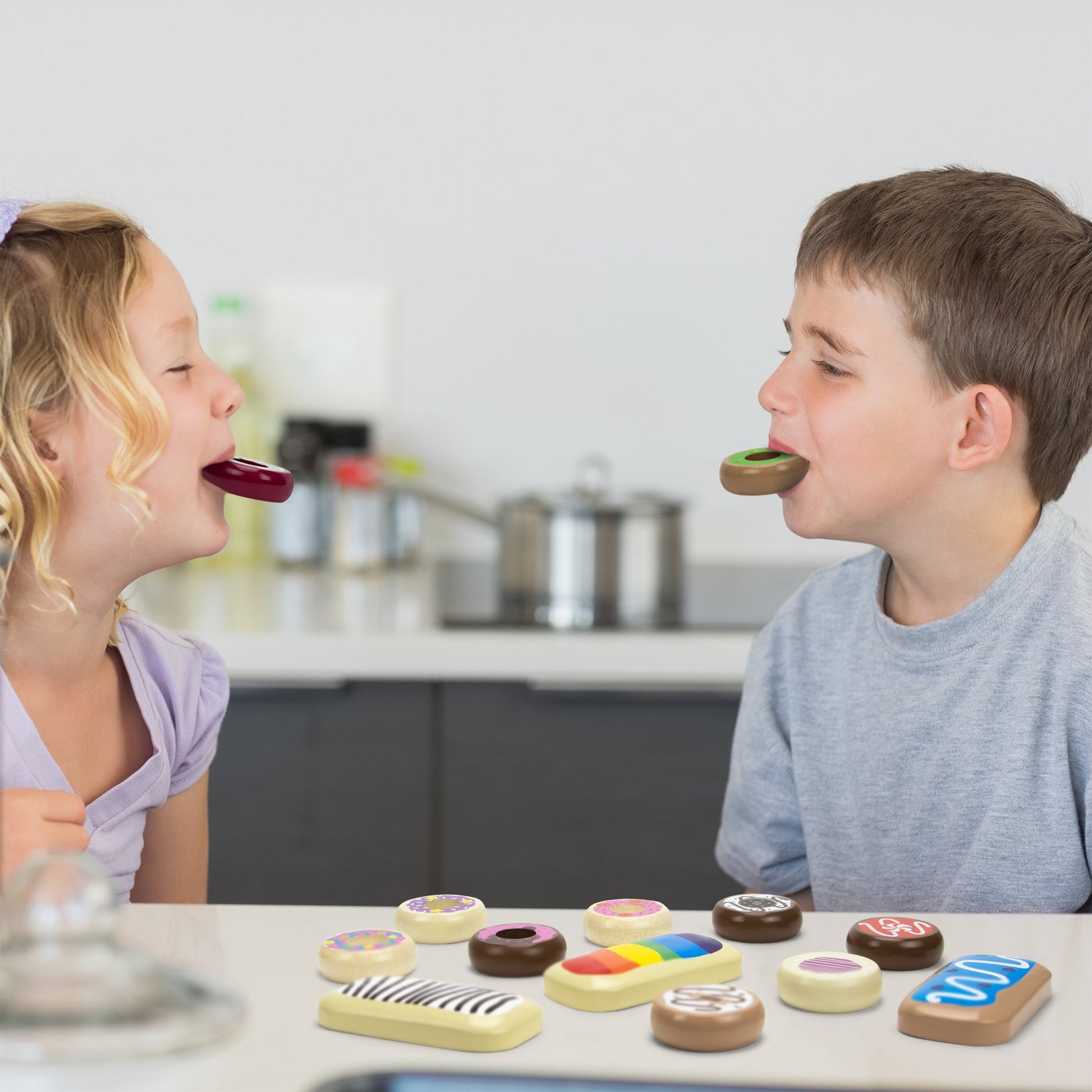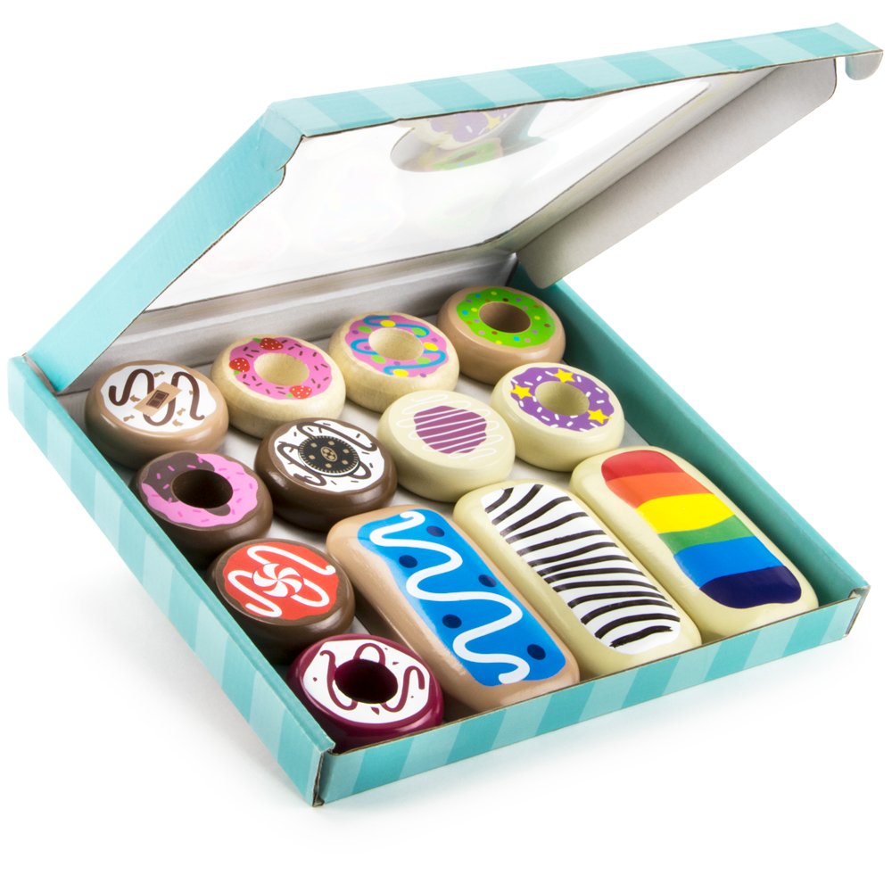 Go Nuts For Donuts: A bakers dozen wooden pastry donuts, youre in for a real treat | Delightful Designs: Each donut was illustrated with its own unique design and name | A Bakers Dozen: With 13 donuts in total 3 long johns, 10 classics you can enjoy Candy Confetti, Cookies & Cream, Strawberry Special and so much more | Sweet Tooth For Learning: Improves fine motor skills, social skills, and imaginative play | Natural Materials: Made from natural cuts of wood and decorated with water-based safe paints