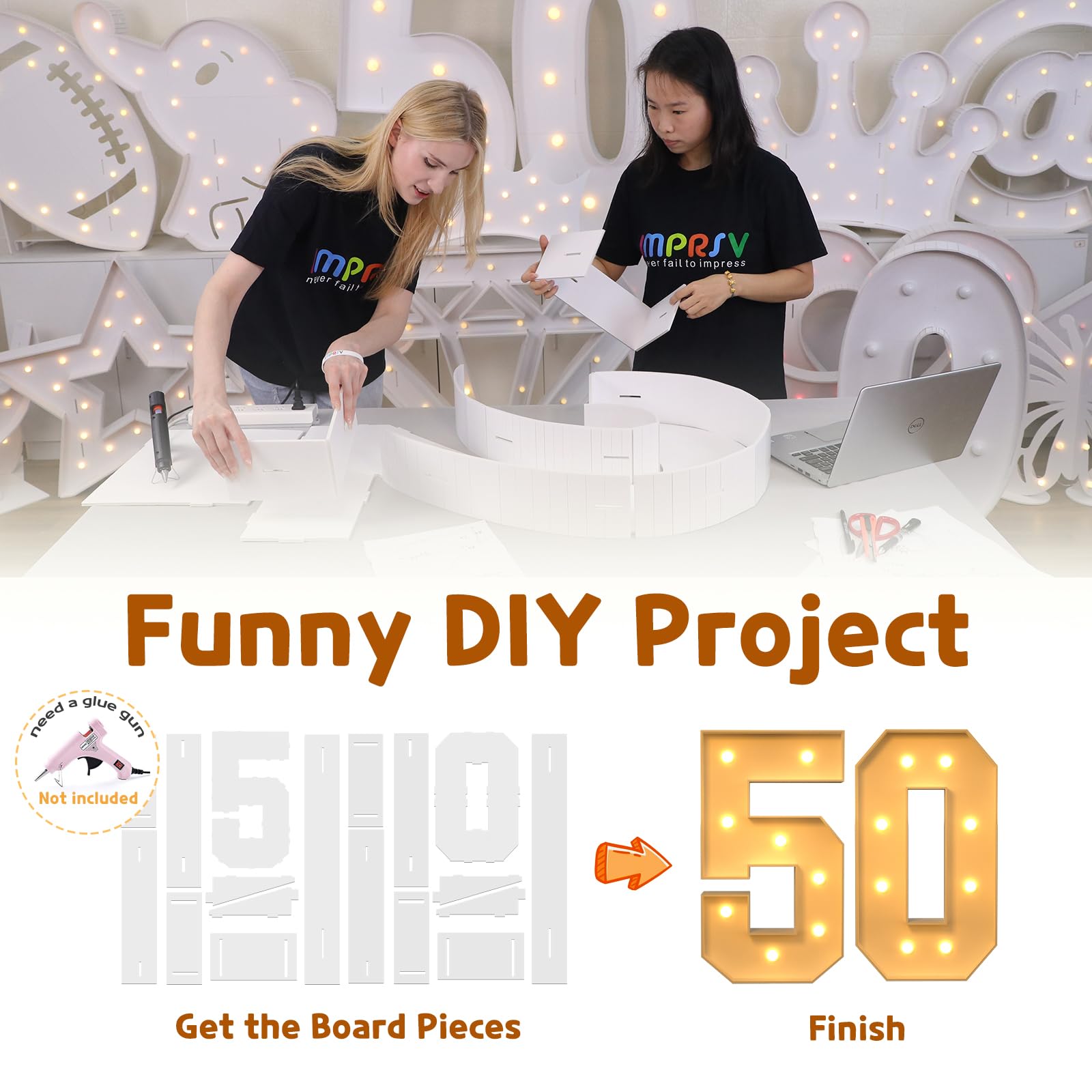 - Q: How do I assemble the 3FT marquee light up numbers? A: To assemble the 3FT marquee light up numbers, start by matching the slots on the pre-cut foam board frames. Use hot glue to secure all boards together, then screw the bulbs onto the board and install 2 AA batteries to light them up.