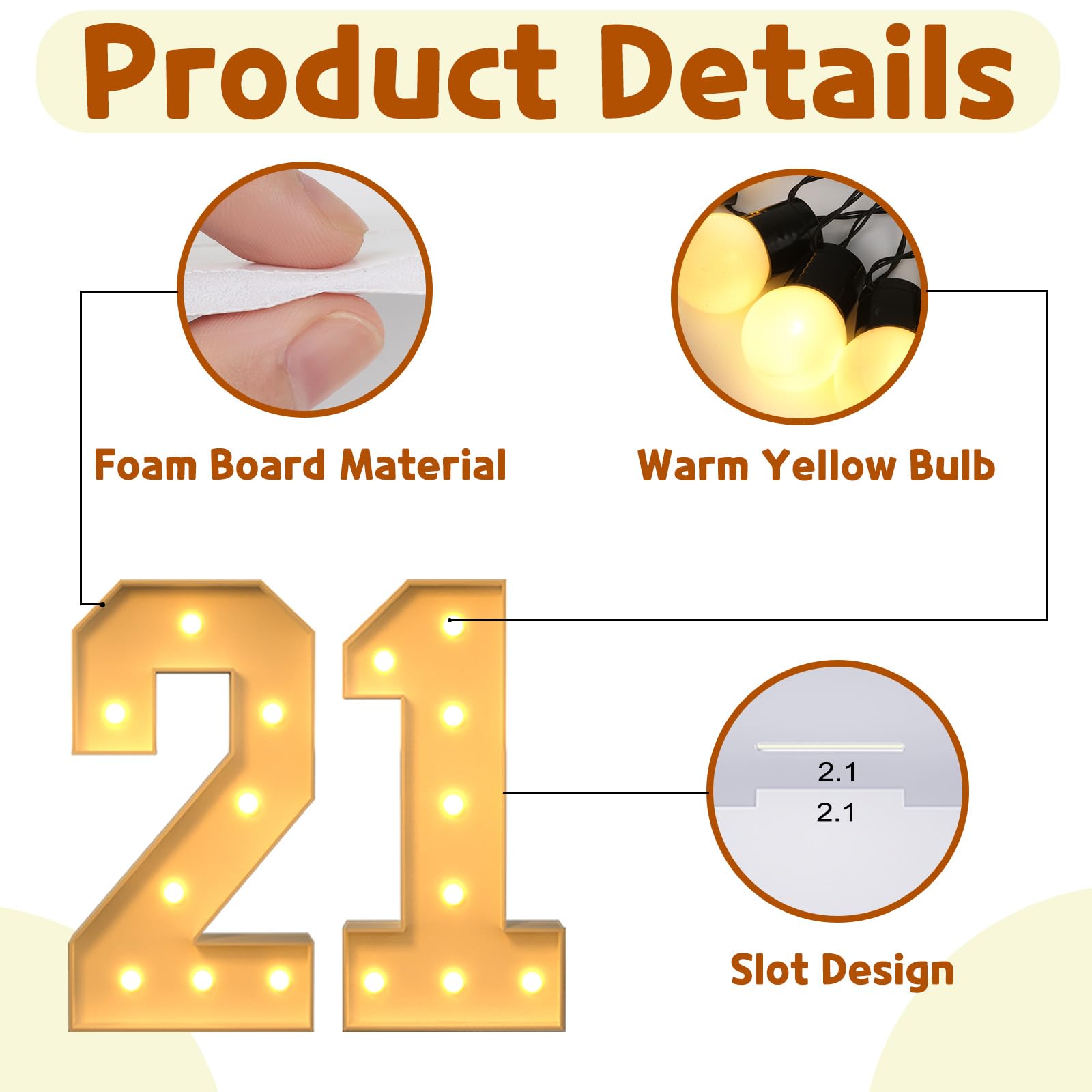 - Q: How do I assemble the imprsv 3FT Light Up Numbers for my party? A: To assemble the imprsv 3FT Light Up Numbers, first match the slots on the pre-cut foam board frames and glue them together using a hot glue gun. Next, screw the included light bulbs onto the board and insert 2 AA batteries to illuminate the numbers.