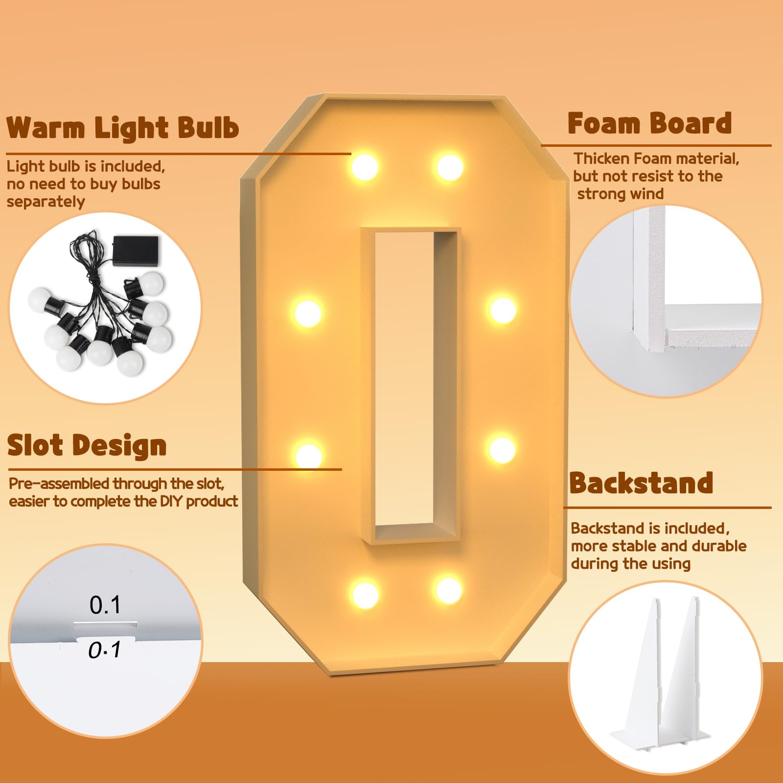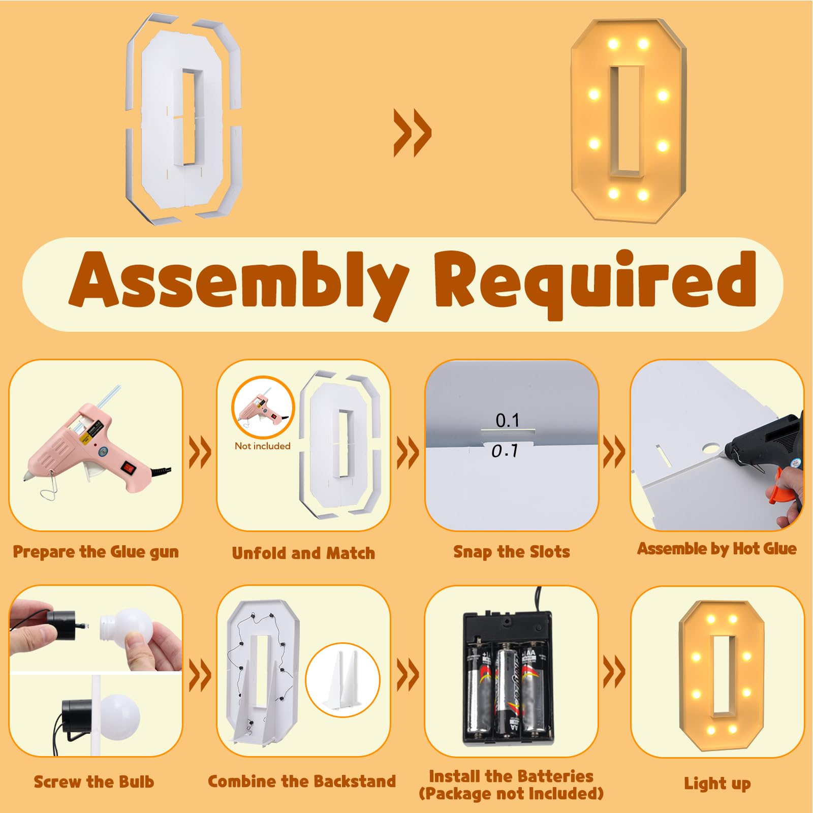 - Q: How do I assemble the marquee numbers? A: To assemble the marquee numbers, match the slots on the pre-cut foam boards and secure them together using hot glue. After the frame is constructed, screw the bulbs onto the board and install 2 AA batteries for power.