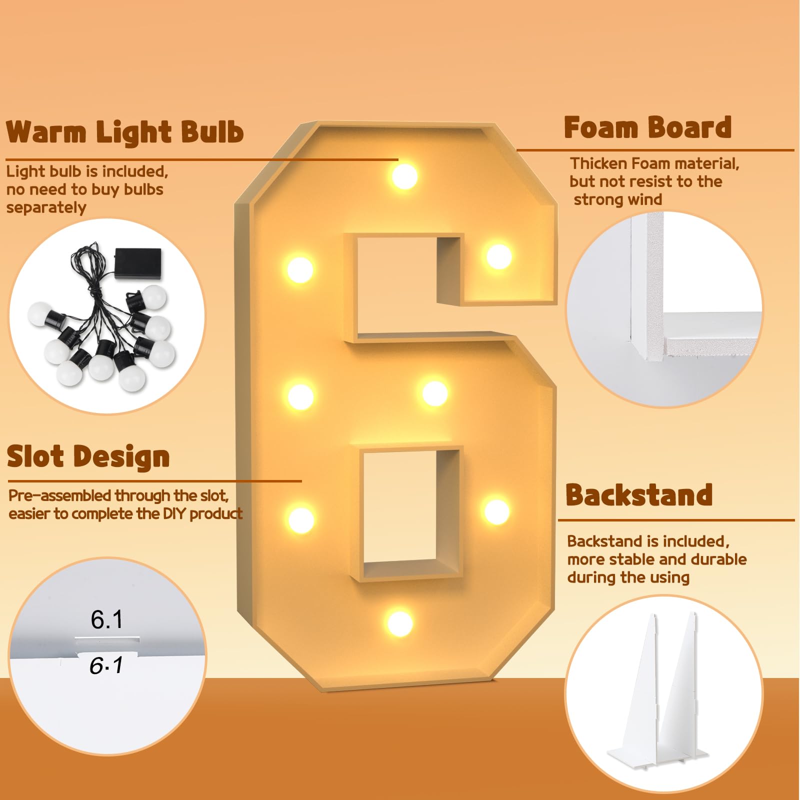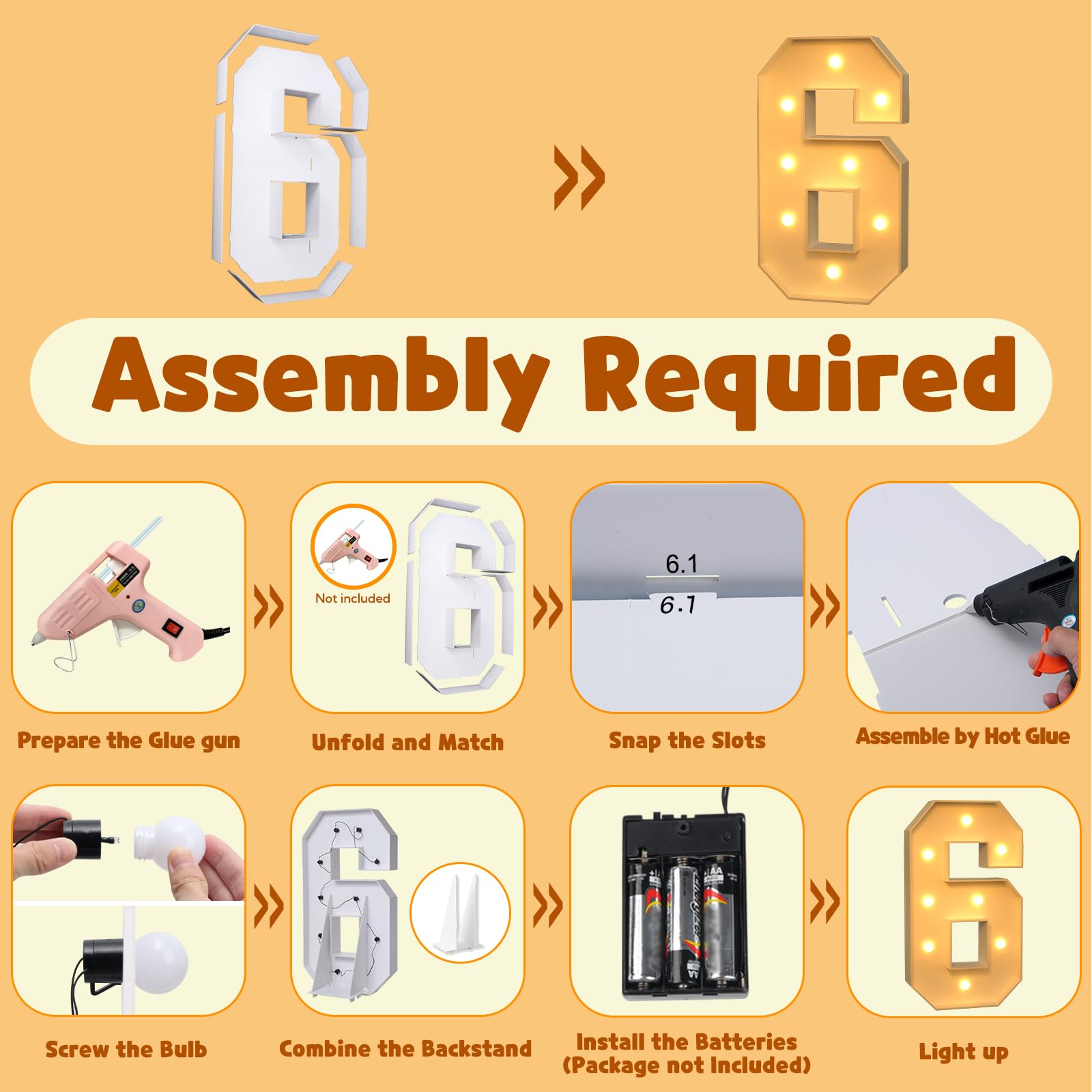 - Q: How do I assemble the marquee number kit? A: To assemble the marquee numbers, align the slots on the pre-cut foam boards and secure them together using hot glue. After that, screw the included light bulbs onto the board and install 2 AA batteries to bring your numbers to life.