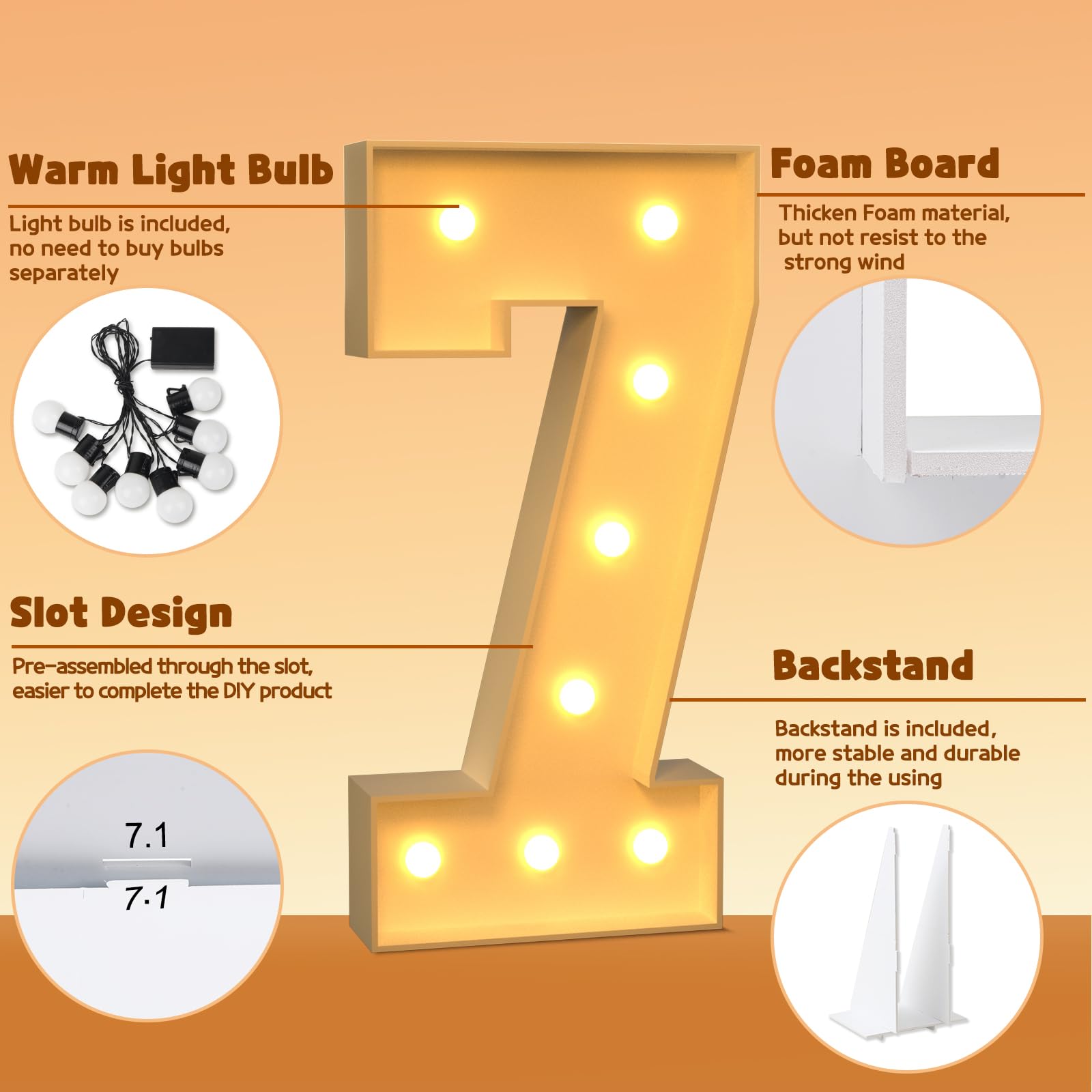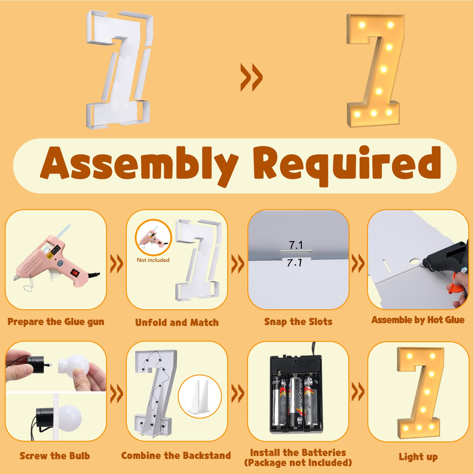 - Q: What materials are included in the package for the marquee numbers? A: The package includes a set of pre-cut foam board frames for the light-up numbers, a string of light bulbs, and assembly instructions. Please note that a glue gun and batteries are not included in the package.