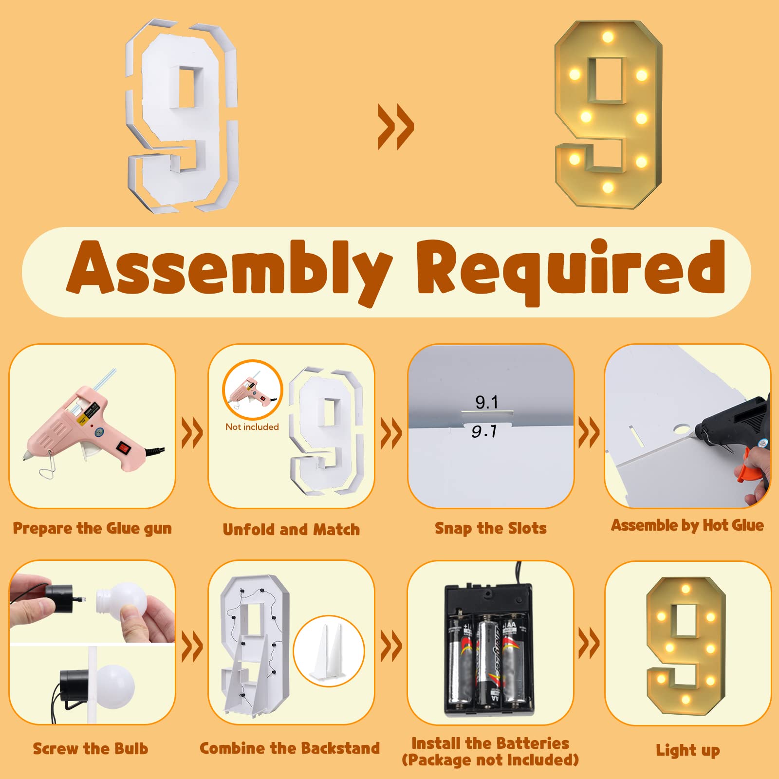 - Q: Do the light up numbers come with batteries and a glue gun? A: No, the package does not include batteries or a glue gun. You will need to provide 2 AA batteries and a hot glue gun to complete the assembly of the marquee numbers.