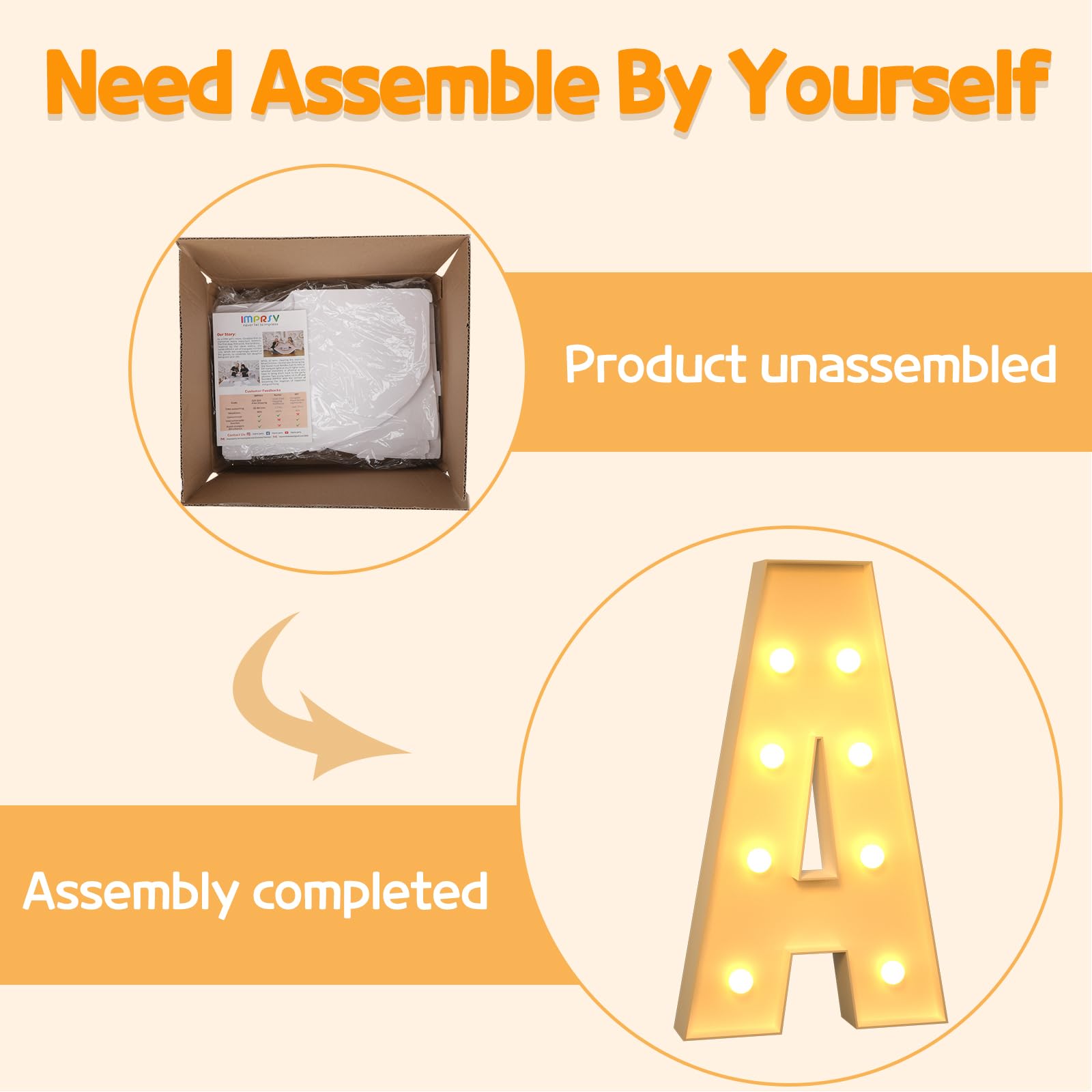 - Q: Do the marquee letters come with compatible light strings? A: Yes, the imprsv marquee light up letters include matching light strings, allowing for a seamless setup without the hassle of finding compatible lights.