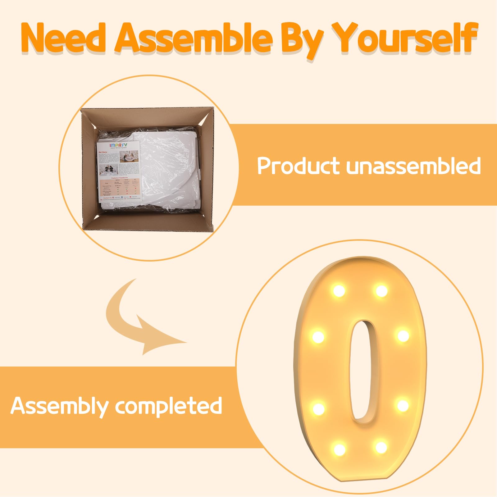 - Q: How do I assemble the Imprsv 3FT Marquee Light Up Letter O? A: Assembling the Imprsv 3FT Marquee Light Up Letter O is easy. It comes with a splicing mode and numbered instructions. Simply align the pieces, insert the bottom plate, and reinforce it with a hot glue gun to secure the structure.