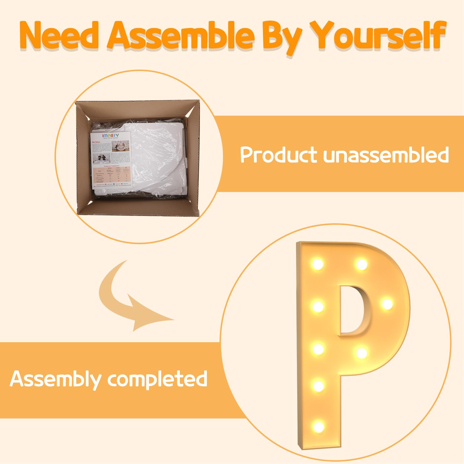 - Q: How do I assemble the imprsv 3FT Marquee Light Up Letters? A: The imprsv 3FT Marquee Light Up Letters are made from foam board and are easy to assemble. Simply follow the numbered instructions provided, align the pieces, insert the bottom plate, and use a hot glue gun to reinforce it. Once completed, your marquee letter will be ready for use!