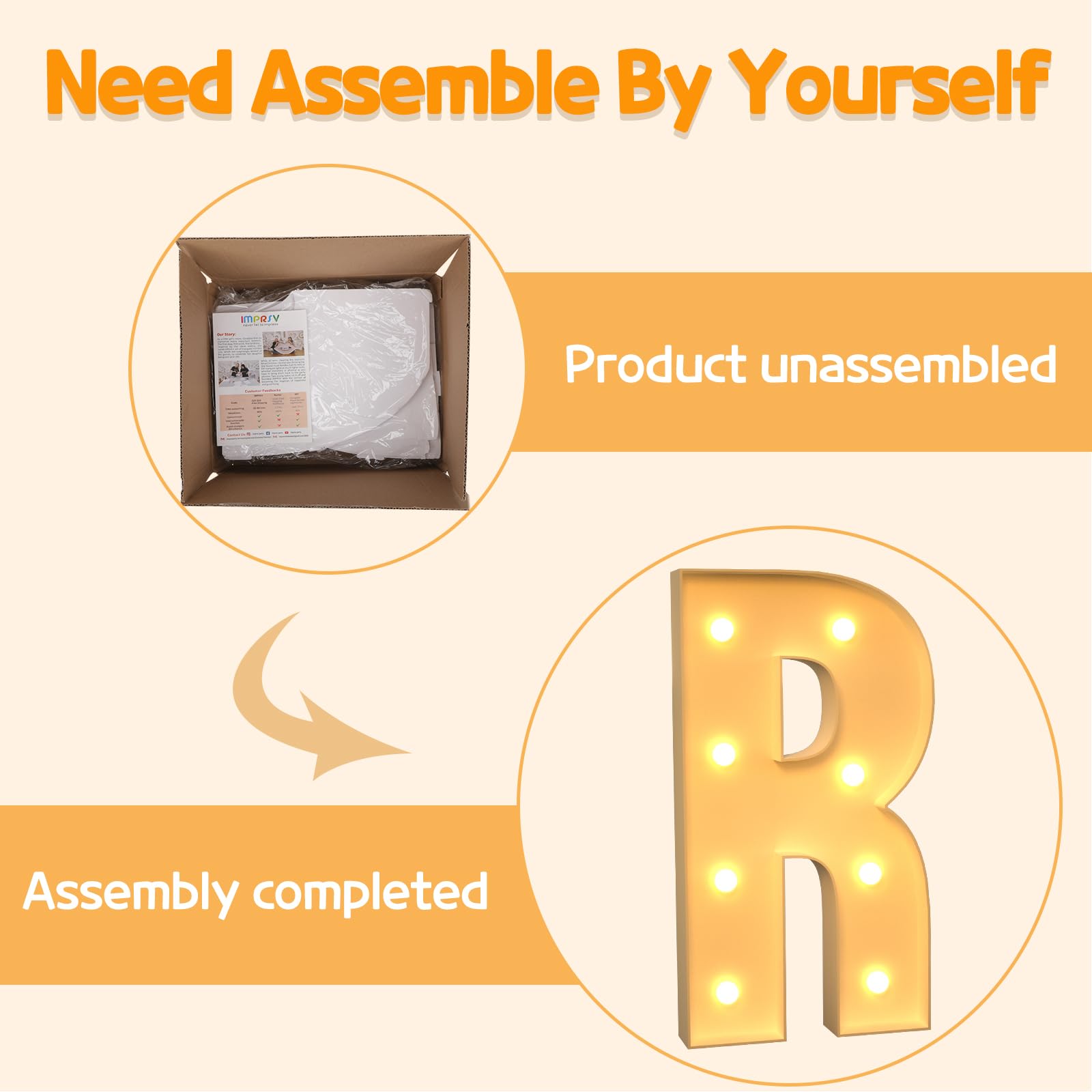 - Q: How do I assemble the 3FT Marquee Light Up Letters? A: The assembly of the 3FT Marquee Light Up Letters is straightforward. Follow the numbered instructions provided, align the pieces, insert the bottom plate, and secure it using a hot glue gun. This foam board construction is designed for easy assembly.