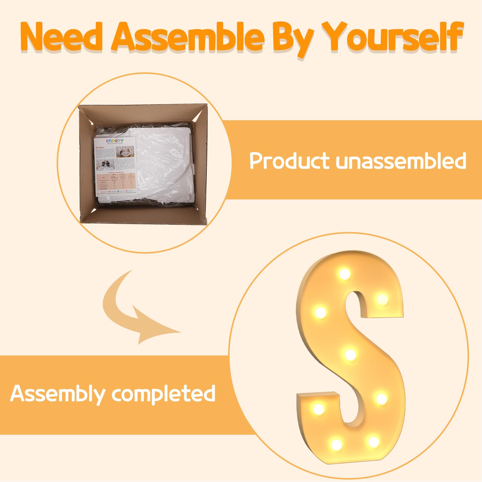 - Q: How do I assemble the marquee light up letters? A: The marquee light up letters are designed for easy assembly. Simply follow the numbered instructions provided, align the pieces, insert the bottom plate, and secure it with a hot glue gun. It only takes a few simple steps to set up your letters!