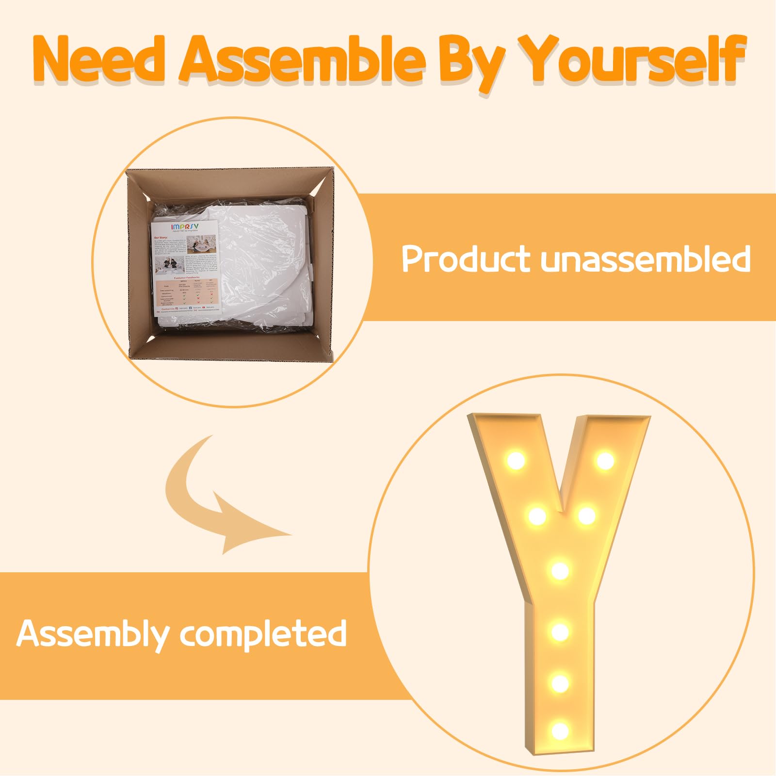 - Q: How do I assemble the imprsv 3FT Marquee Light Up Letters? A: Assembling the imprsv 3FT Marquee Light Up Letters is straightforward. Follow the numbered instructions provided to align the pieces and insert the bottom plate. Use a hot glue gun to reinforce the structure, and you'll have your letters ready in no time.