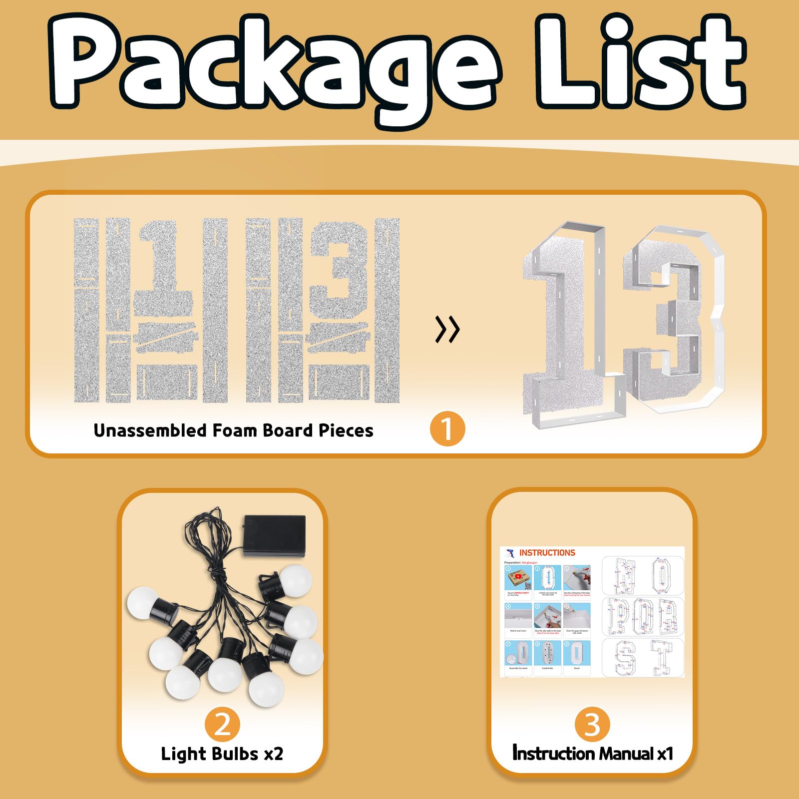- Q: How do I assemble the light-up number decorations? A: To assemble the light-up number decorations, match the slots on the pre-cut foam board with the frame and secure them using a hot glue gun. Then, attach the light bulbs by screwing them onto the frames as per the provided assembly instructions.