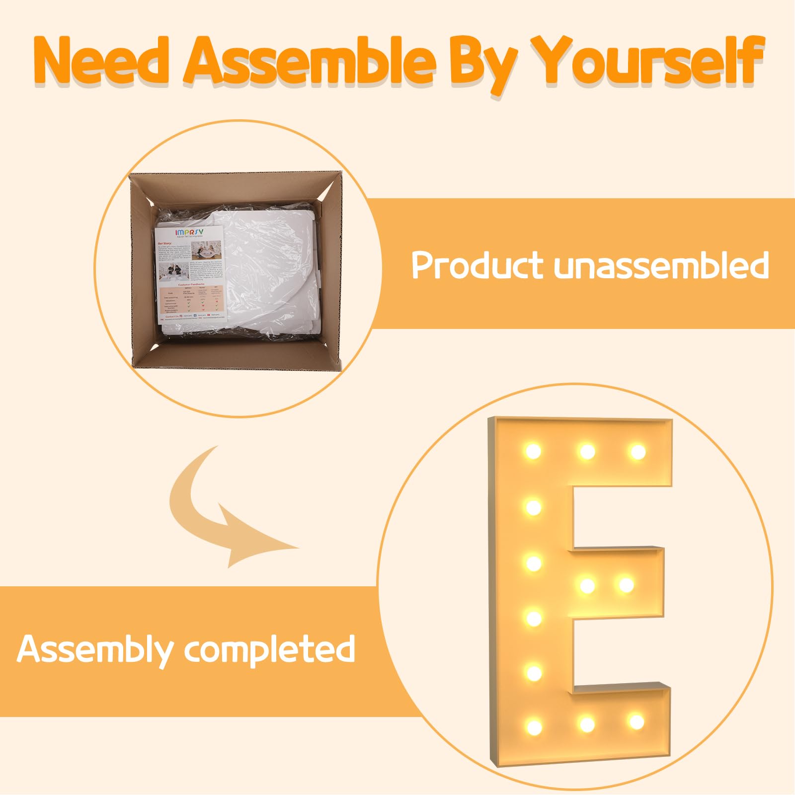 - Q: How easy is it to assemble the 4FT marquee light up letters? A: The assembly of the 4FT marquee light up letters is quite simple. They are made from foam board and come with clear numbered instructions. Just align the pieces, insert the bottom plate, and reinforce with a hot glue gun to complete the setup.