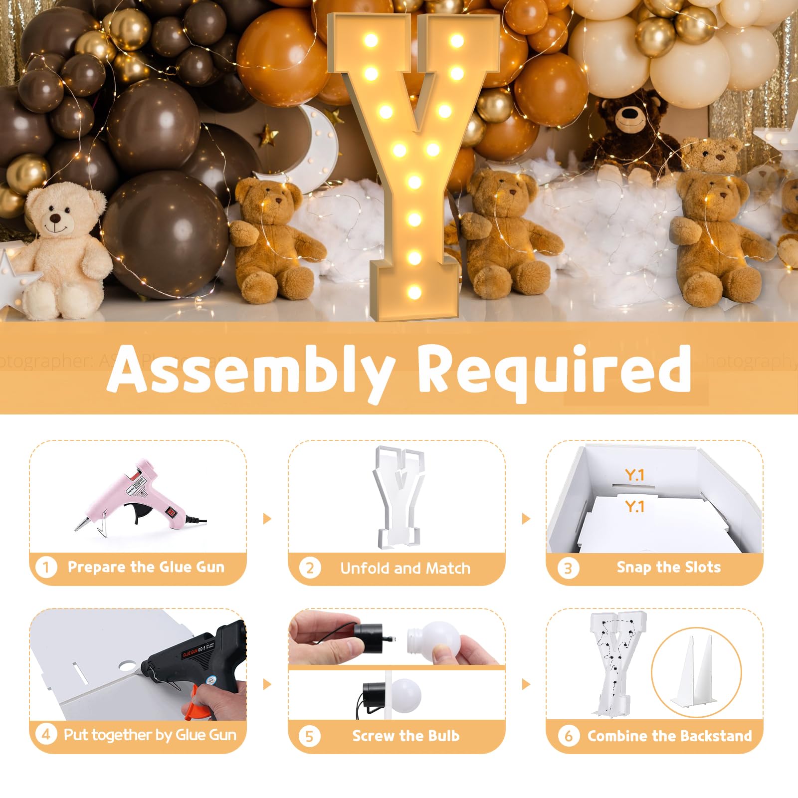 - Q: How do I assemble the marquee light up letters? A: Assembling the marquee light up letters is straightforward. Each letter comes as a pre-cut foam board frame with slots. Simply match the slots on the board and glue the pieces together using a hot glue gun. After that, screw in the bulbs and insert 3 AA batteries to light up your letter.