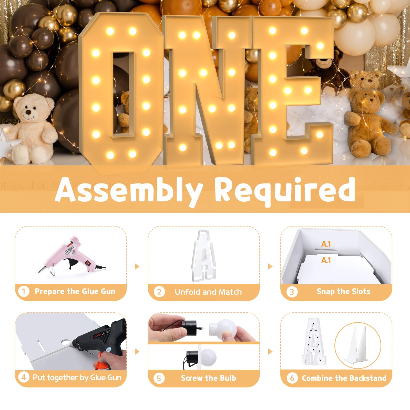 - Q: How do I assemble the marquee light up letters? A: To assemble the marquee letters, match the slots on the pre-cut foam board frames and use a hot glue gun to secure them together. Then, screw in the bulbs and install 3 AA batteries (not included) to light them up.