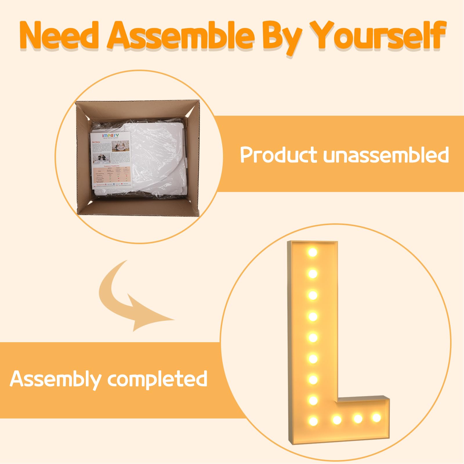 - Q: How do I assemble the Imprsv 4FT Marquee Light Up Letter L? A: The assembly of the Imprsv 4FT Marquee Light Up Letter L is simple. It is made from foam board and can be easily assembled using our splicing mode. Follow the numbered instructions to align and insert the bottom plate, and reinforce it with a hot glue gun. Once completed, your light up letter is ready for display!