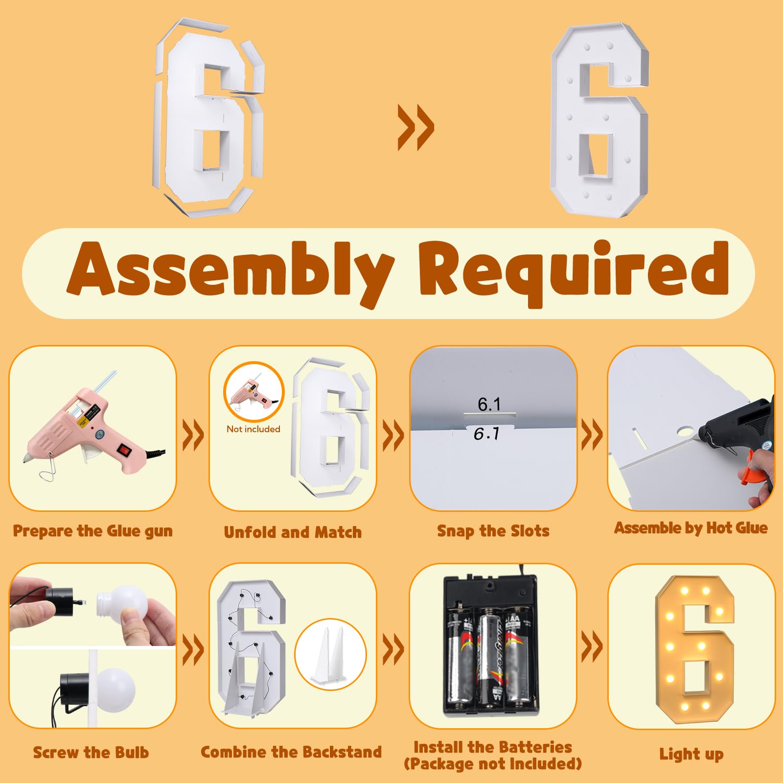 - Q: How do I assemble the marquee numbers for my party? A: To assemble the marquee numbers, you'll need to match the pre-cut slots on the boards and use hot glue to secure them together. After that, screw in the bulbs and install 2 AA batteries to light them up.