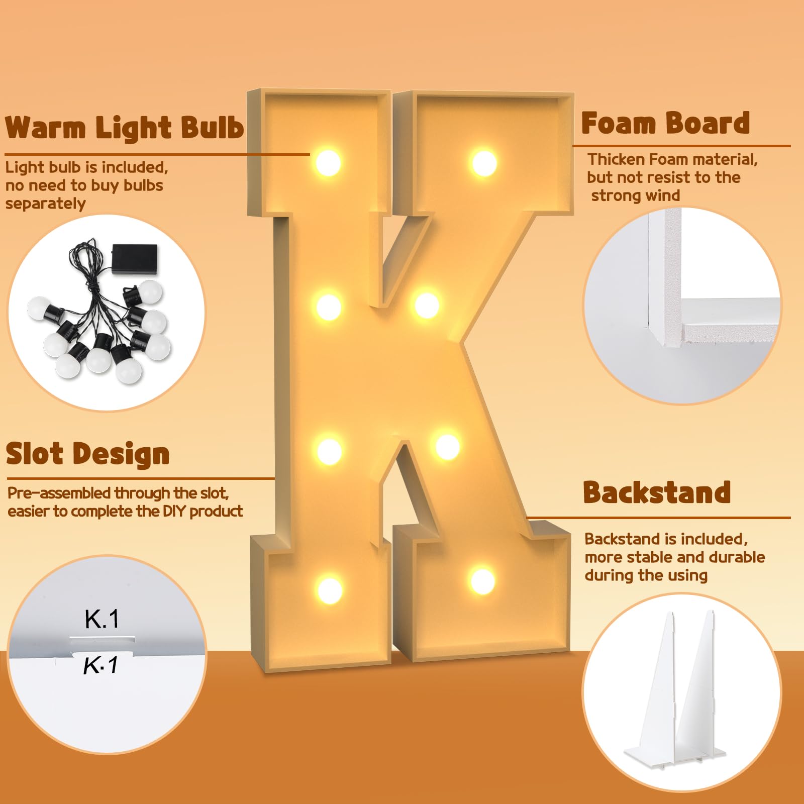 - Q: How do I assemble the Marquee Letter K? A: To assemble the Marquee Letter K, match the slots on the pre-cut boards and use hot glue to secure them together. Then, screw the bulbs onto the board and install 2 AA batteries to illuminate the letter.