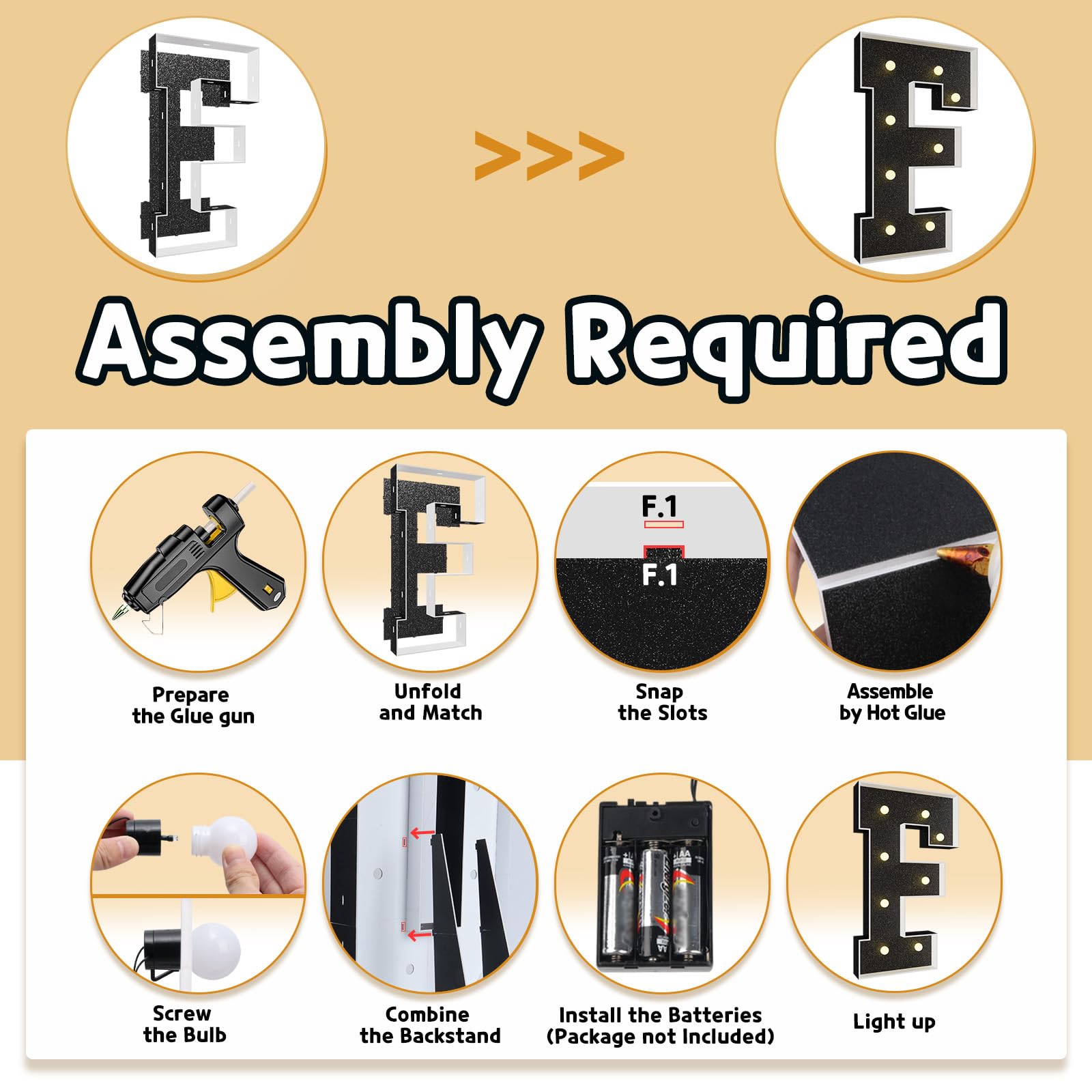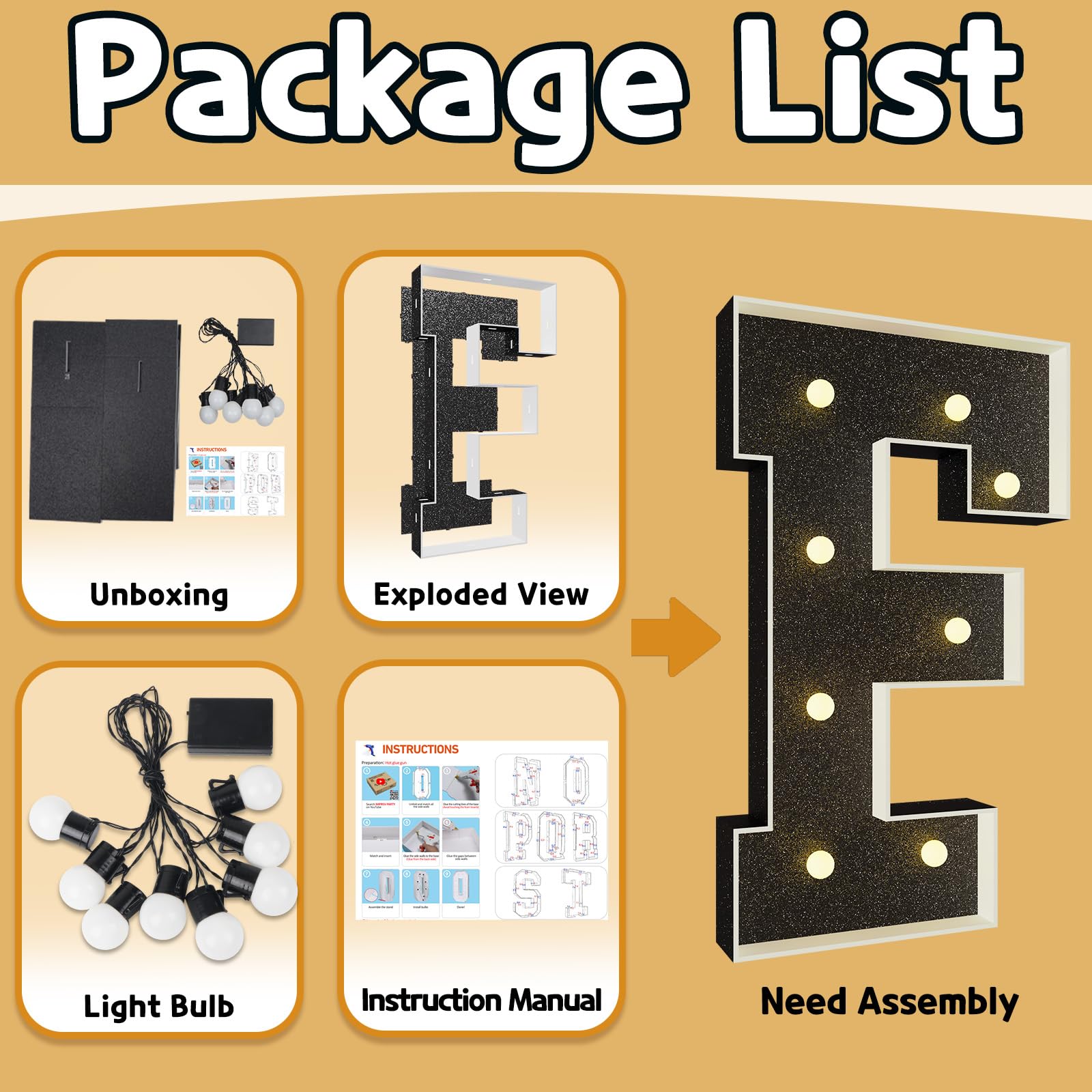 - Q: How do I install the marquee letters for my event? A: Installation is simple: the package includes pre-cut foam board letter frames and a light bulb string. Just follow the assembly instructions to secure the frames with a hot glue gun and attach the bulbs.