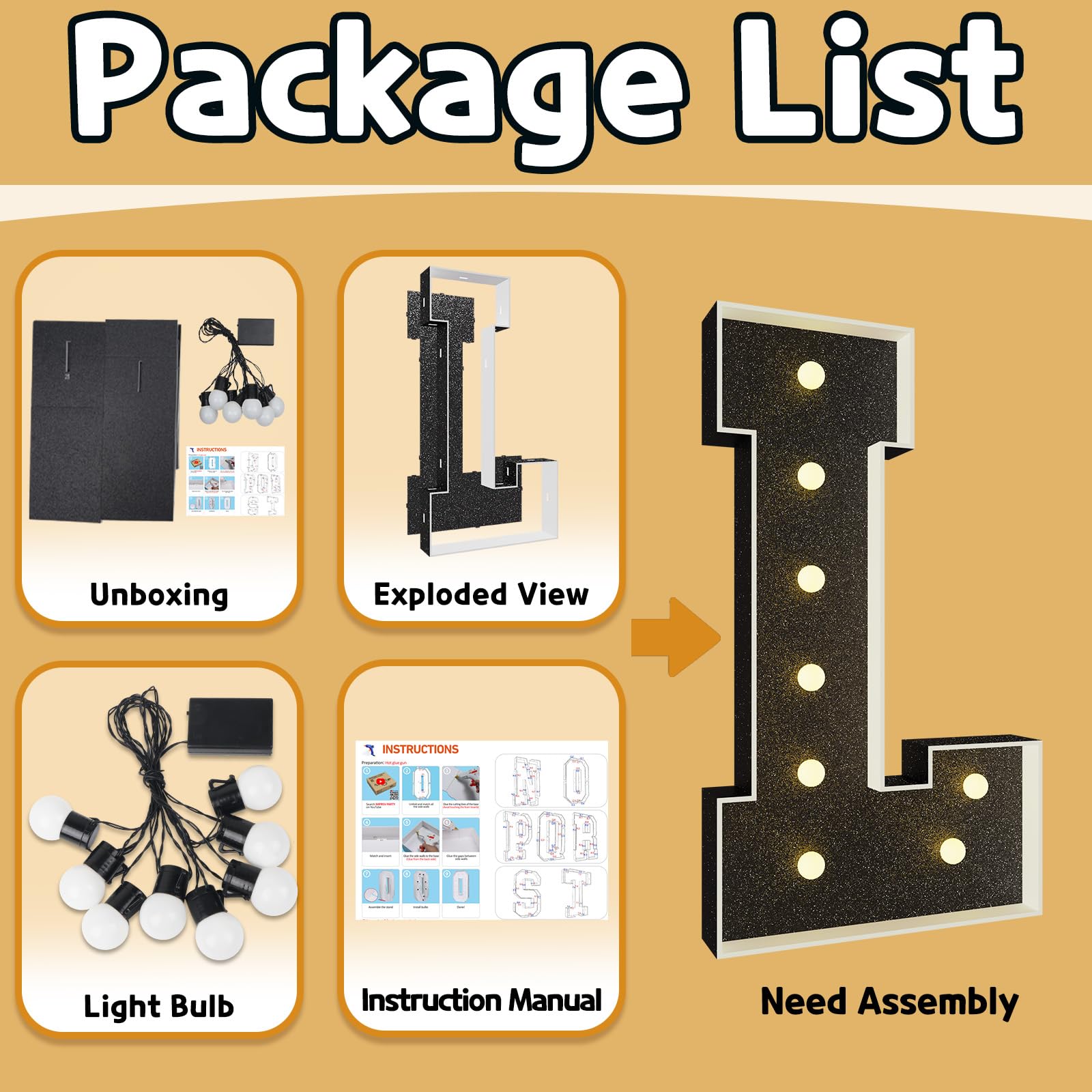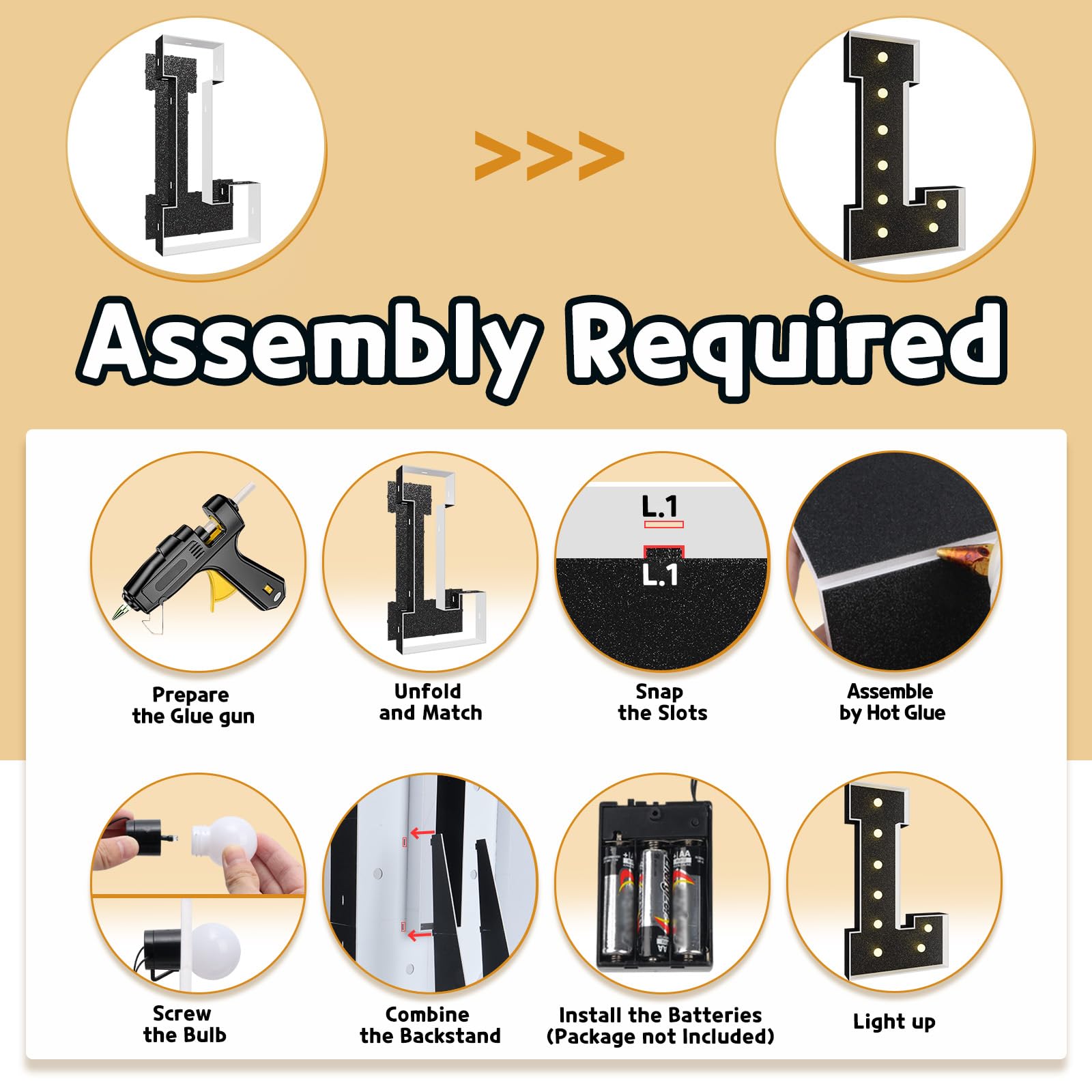 - Q: How do I assemble the light-up marquee letter? A: Assembling the marquee letter is easy. The package includes pre-cut foam board letter frames and a light bulb string. Simply match the slots on the board with the frame, secure them with a hot glue gun, and attach the bulbs by screwing them onto the frames.