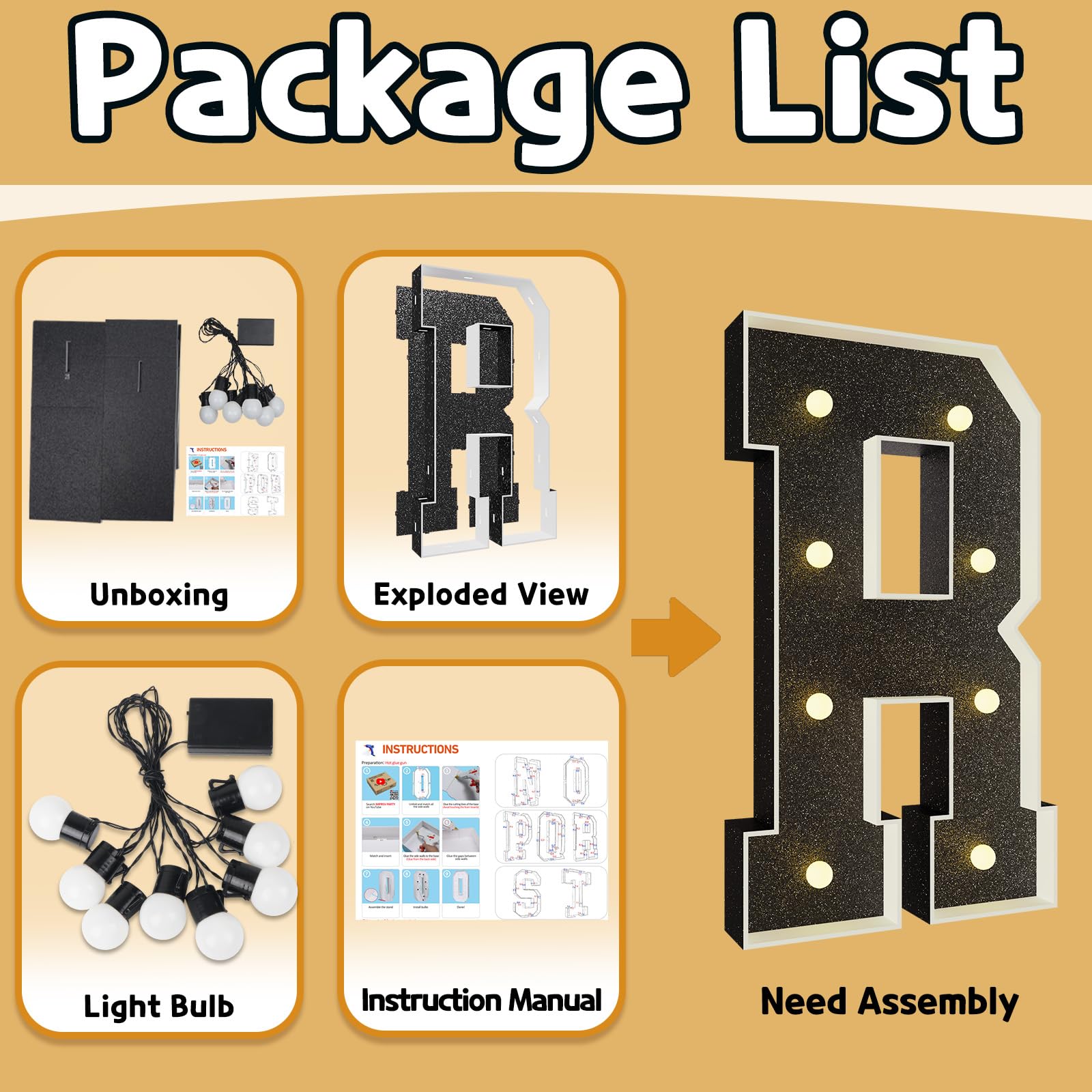 - Q: How do I assemble the marquee letters? A: Assembling the marquee letters is easy. Each package includes pre-cut foam board letter frames and a light bulb string. Simply match the slots on the board with the frame and secure them using a hot glue gun, which is not included.