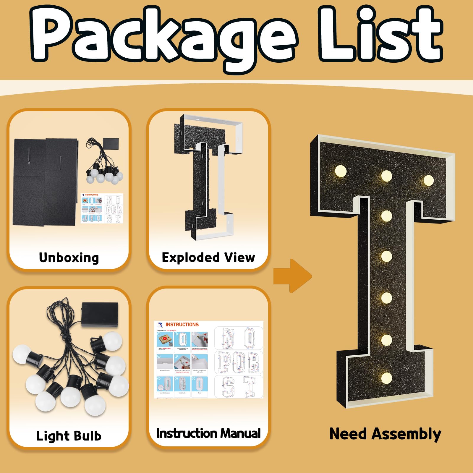 - Q: How do I install the light-up marquee letter? A: Installation is simple: each package includes pre-cut foam board letter frames, a light bulb string, and detailed assembly instructions. You will need a hot glue gun to secure the frames and attach the bulbs.