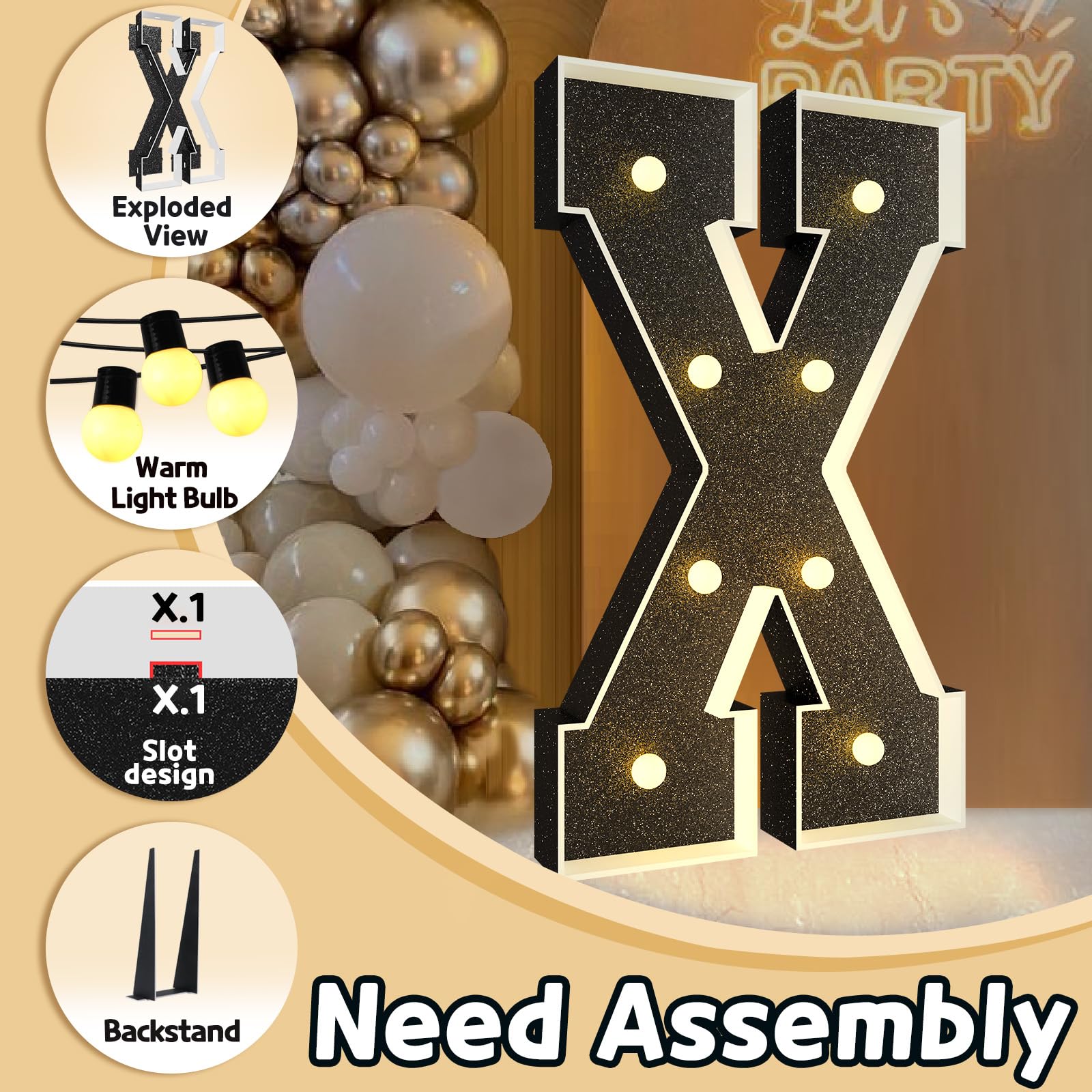 - Q: How do I assemble the Marquee Letters? A: Assembling the imprsv Marquee Letters is easy. Each package includes pre-cut foam board letter frames, a light bulb string, and assembly instructions. Simply match the slots on the board with the frame and secure them using a hot glue gun. Then, attach the bulbs by screwing them onto the frames.