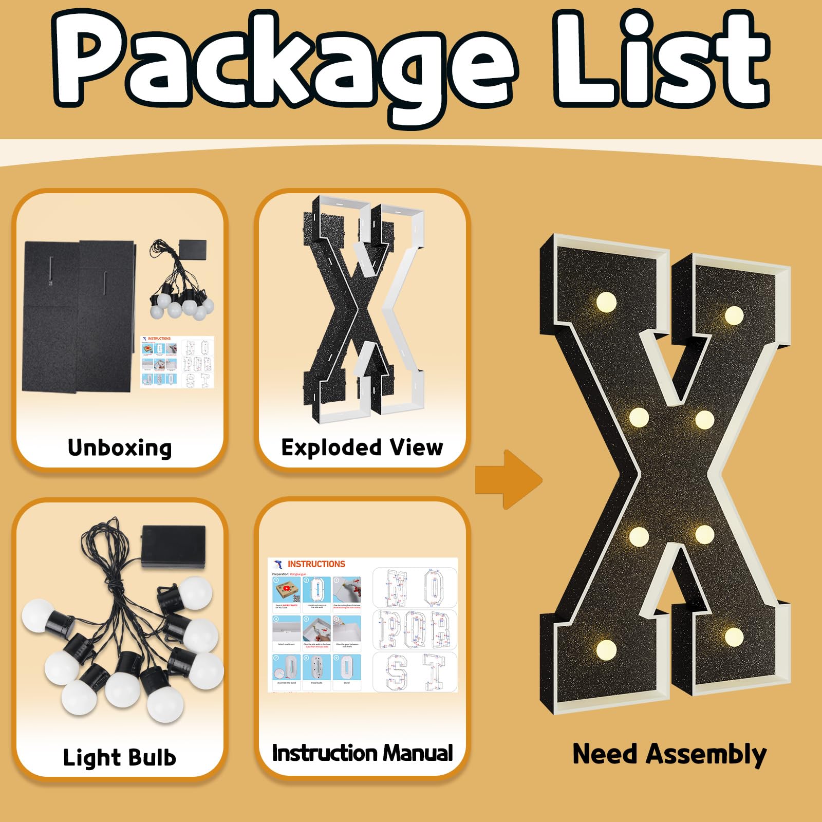 - Q: Is a hot glue gun included with the Marquee Letters? A: No, the package does not include a hot glue gun. You will need to prepare your own hot glue gun to assemble the letters and bring them to life for your event.