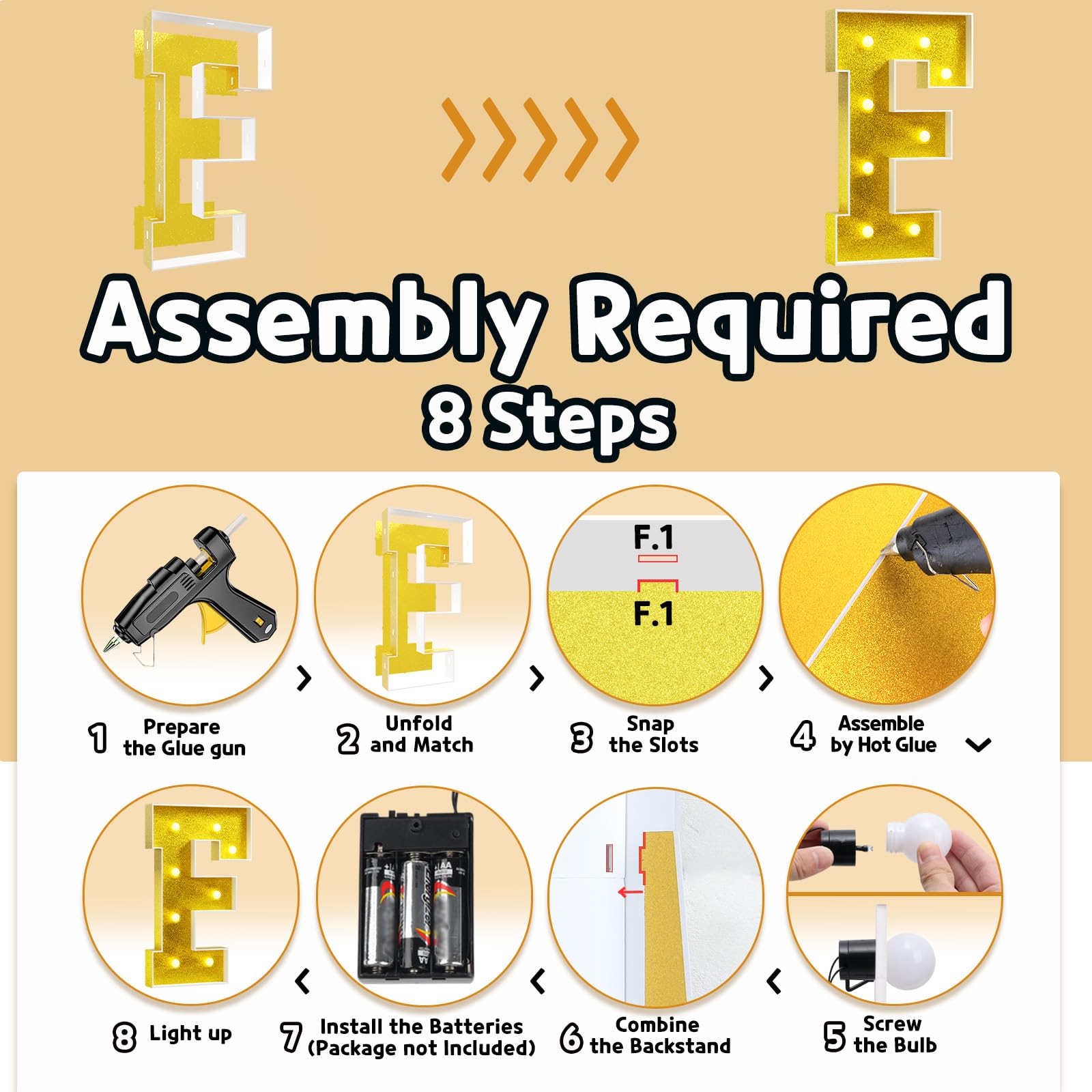 - Q: How do I assemble the marquee letters? A: The assembly is straightforward; the package includes pre-cut frames, light string, and instructions. Use a hot glue gun to secure the frame pieces and attach the bulbs.